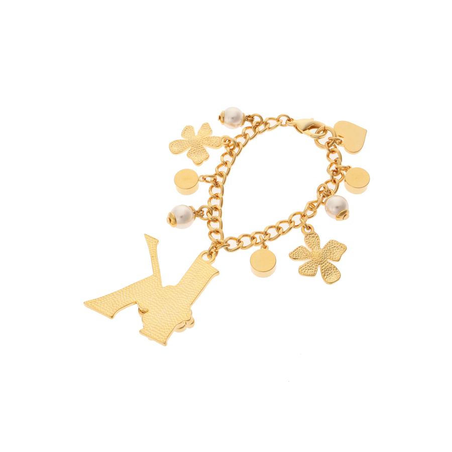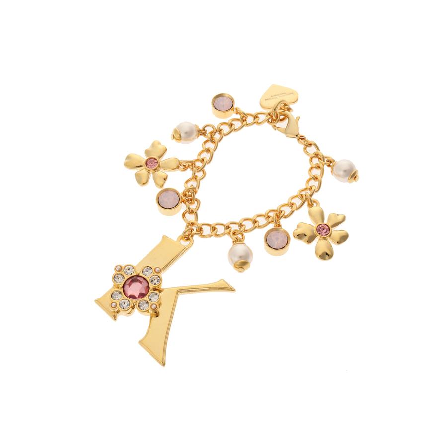 イニシャルによってストーンのカラーが違うのもポイントです。どのデザインのバッグにもマッチするようにゴールドベースで仕上げているので、通年使っていただけるデザインです。