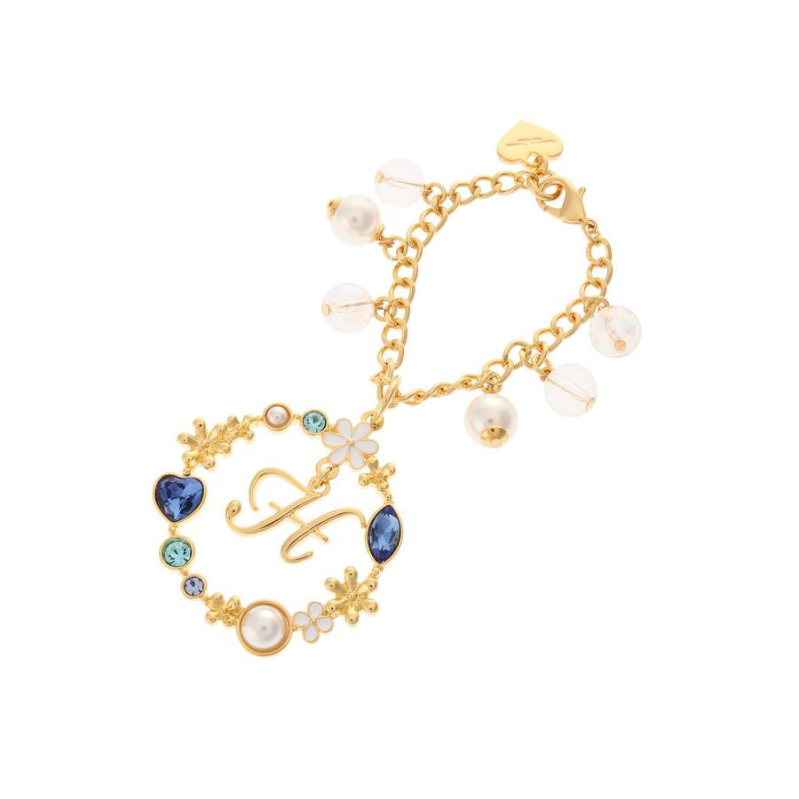 イニシャルの周りにはハートのラインストーンやフラワーモチーフをあしらい、華やかな印象のアイテムです。