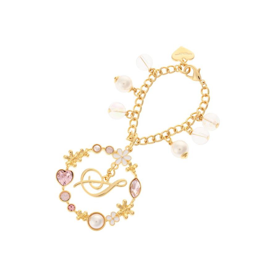 イニシャルの周りにはハートのラインストーンやフラワーモチーフをあしらい、華やかな印象のアイテムです。