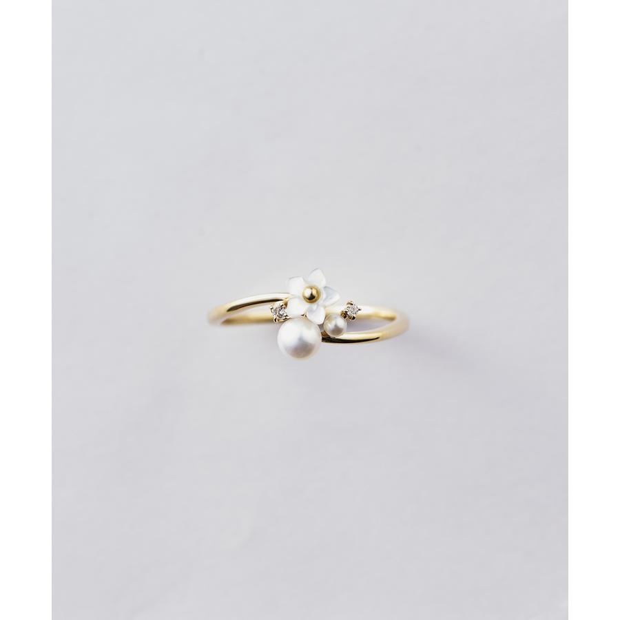 小さな花は可憐な白ちょう、上品な輝きはパール、華やかさを加えたダイヤモンド。素材にもこだわり、大人な女性に身に着けて欲しい上品で華やかなジュエリーです。優しい雰囲気は大人のフェミニンスタイルにぴったりです。トレンド感溢れるフォークリングはパールと華奢なストーンを合わせてお花のように華やかに。付け根のラインが隠れるので指を細く華奢に見せてくれます