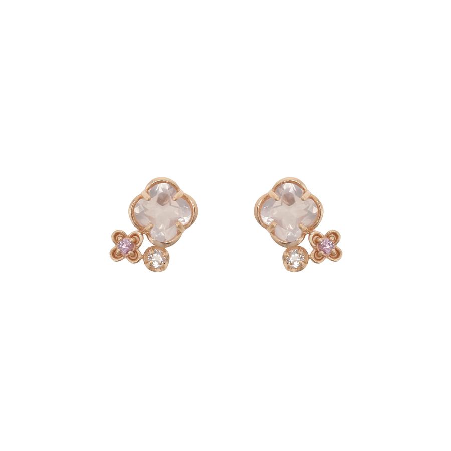 お花の形にカットされたローズクォーツがやさしいピンク色のオーラで包みこみ、内面から輝かせてくれるジュエリー。