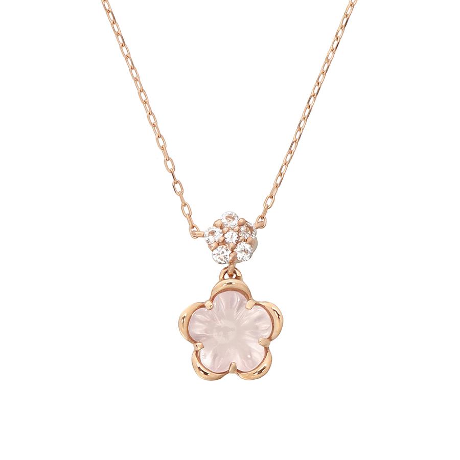 ピンクゴールドにローズクォーツを組み合わせ、フェミニンなカラーリングのネックレス。