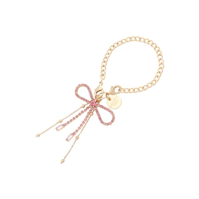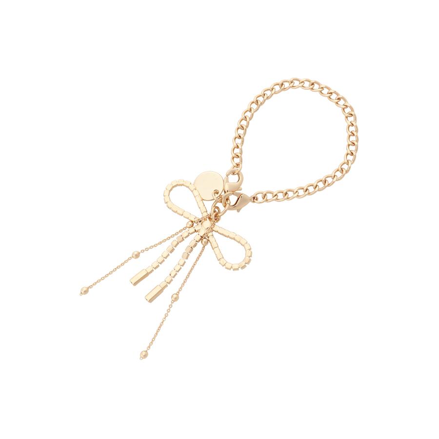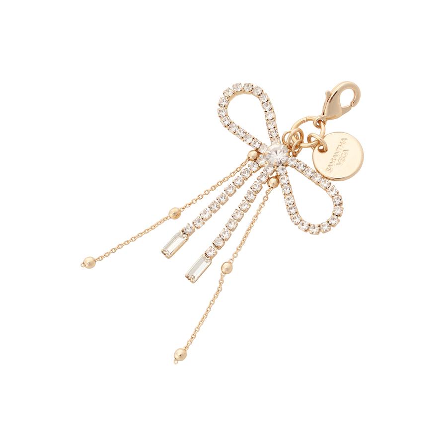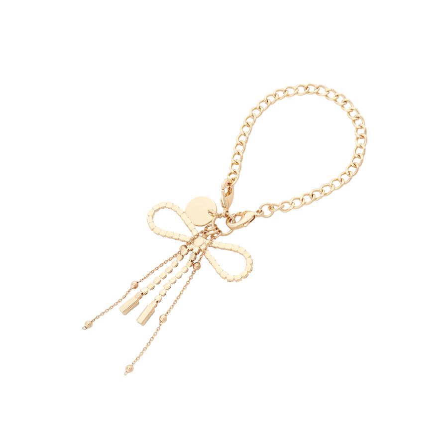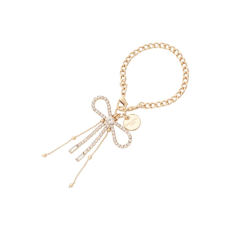 新作「Swing Ribbon」シリーズから、リボン×ビジューの可愛いが詰まったバッグチャームが登場。リボンの結び目からは、ゴールドの輝きが美しいチェーンタイプとストーンの輝きが華やかなパヴェタイプの2種類のたれが流れ、動くたびにきらきらと輝きます。