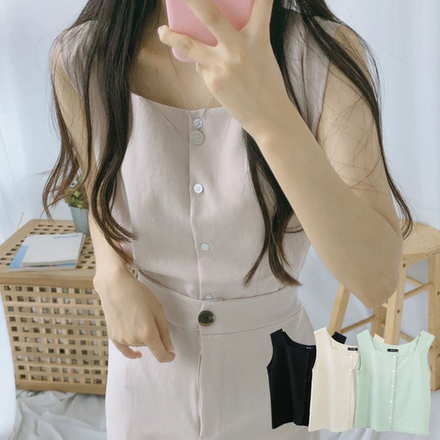 ボタン付きのノースリーブブラウス。スクエアネックでデコルテラインをきれい魅せ。シンプルなシルエットの前開きデザイン。