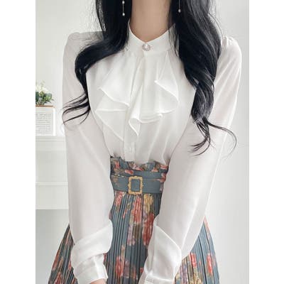 チャイナ襟にポイントパールボタンディテールと共にボリュームのあるフリル使いのブラウス!
