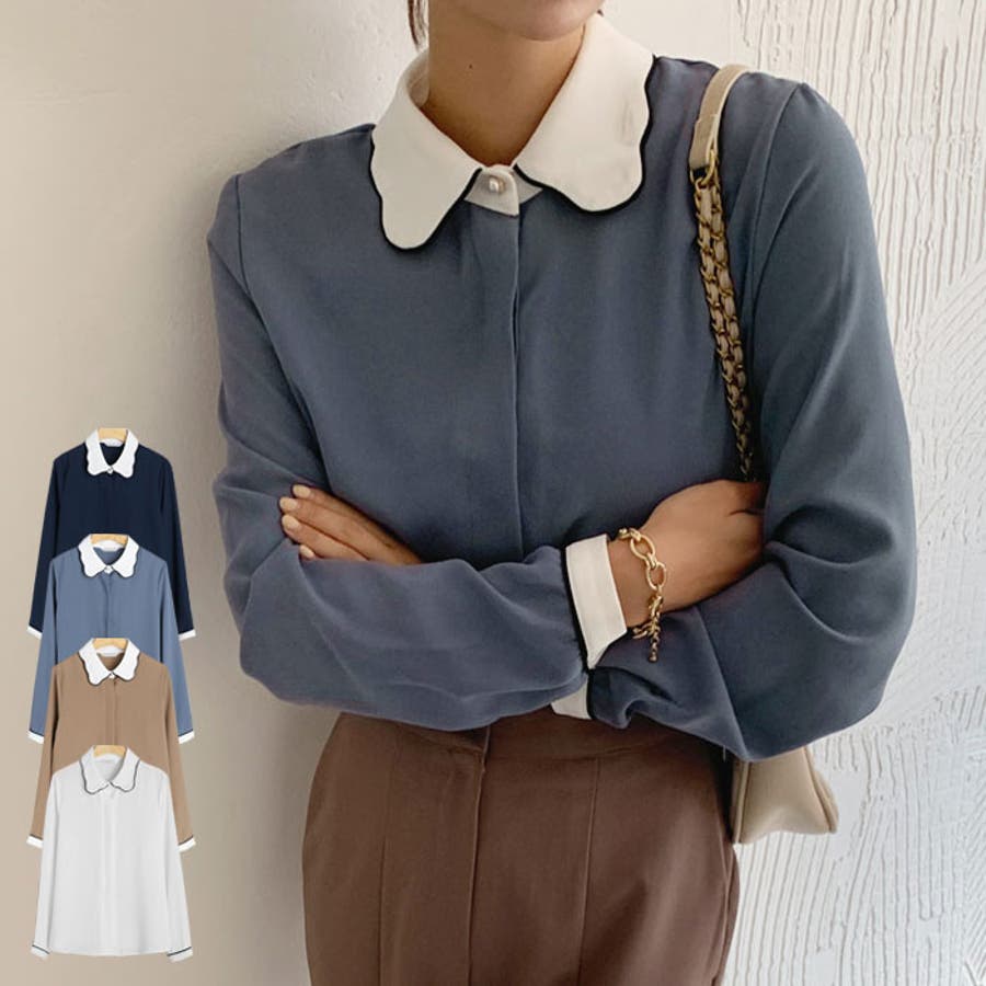 全体的にシンプルなデザインに波模様の襟がポイントのブラウスです。