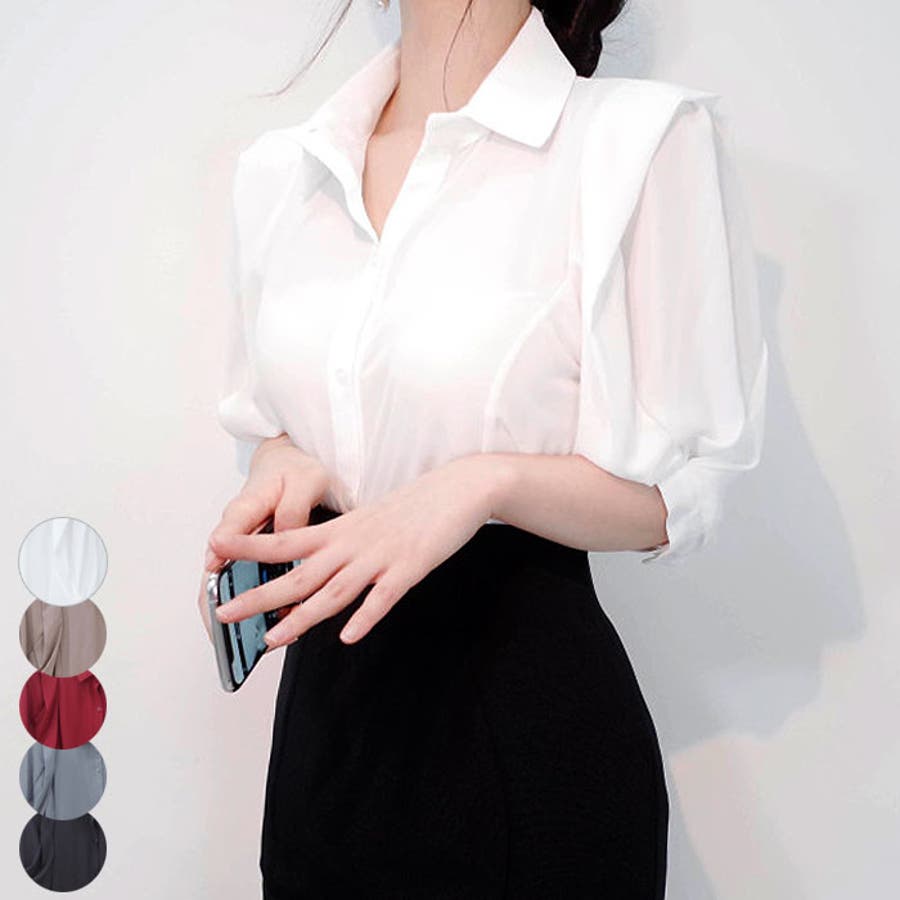 襟付き立体パフスリーブシフォンブラウス 夏 デイリー 五分袖 ブラウス オフィスブラウス 五分袖 襟付きシャツブラウス レディース シャツブラウス きれいめ 韓国 シフォンブラウス 夏 通勤 面接 オフィスブラウス アイボリー ブラック bldo2816