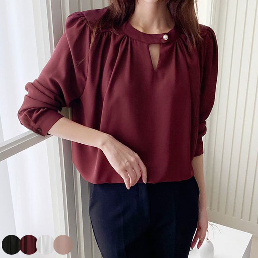 チョーカーパールブラウス 全5色 秋 オフィスブラウス 長袖 トップス シャーリング オフィスルック 秋 韓国ファッション 長袖ブラウス 秋 韓国 レディース きれいめ デイリー シフォンブラウス カジュアル スキッパーネック ブラウス bldo2978