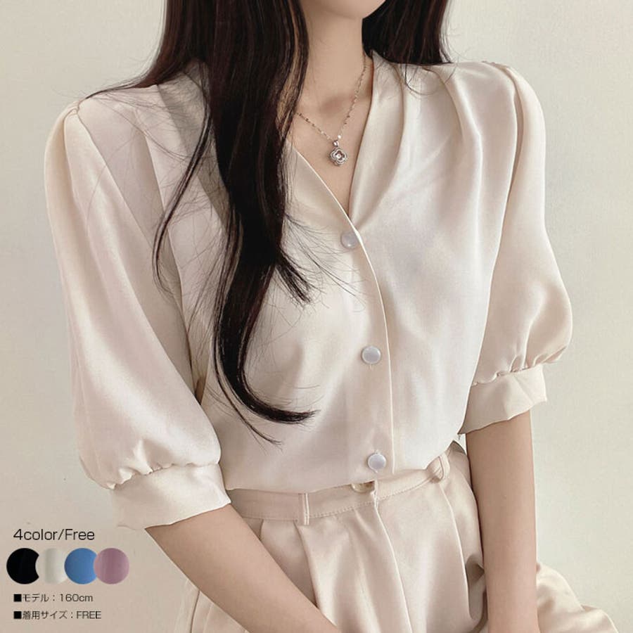 Vネックパフスリーブブラウス半袖 全4色 可愛い