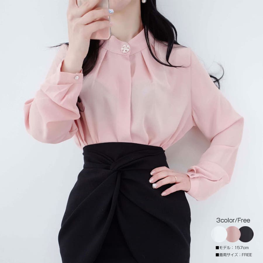 花ブローチ付きピンタックブラウス レディース オフィスブラウス 韓国ファッション シフォンブラウス オフィス ブラウス 長袖 シンプル シャツブラウス きれい デイリー オフィスルック ピンタック ブローチ bldo3170