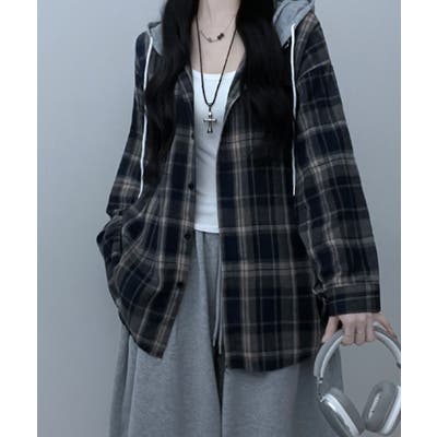 まるでパーカーを重ね着しているかのような、異素材ミックスのフードデザインが魅力のチュニックシャツ。