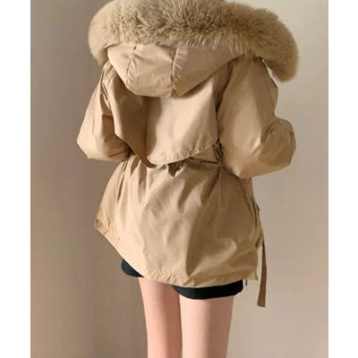 フードの豪華なファーと内側の身頃部分の温かいファー裏地で、真冬も暖かく着用できる厚手のダウンジャケット。