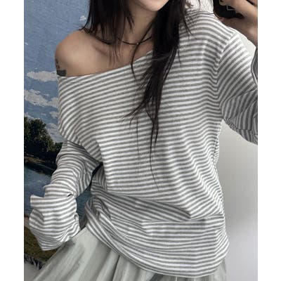 幅の広いボートネックなので、そのまま着るのはもちろん、片方をオフショルダーにして肌見せを楽しむこともできる2WAY仕様です。