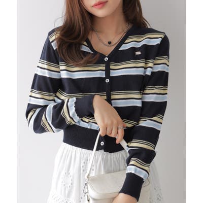 様々なカラーを組み合わせたミックスボーダー柄が魅力のVネックカーディガンです。