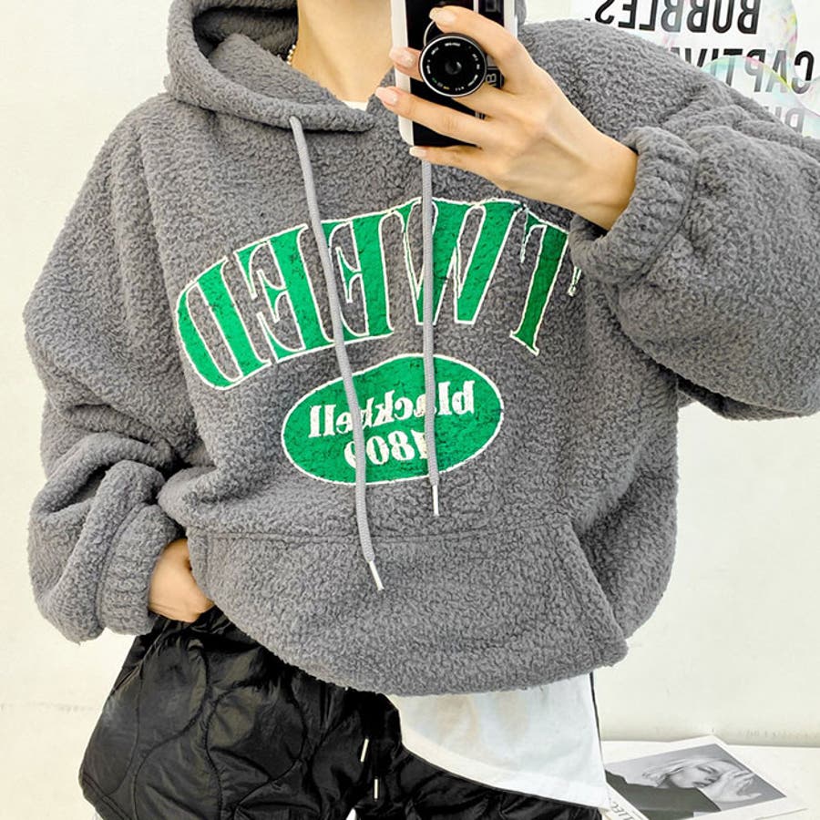 軽やかで暖かいボア素材を使用した、フロントポケットとフードが付いたカジュアルなスウェットトレーナーです。