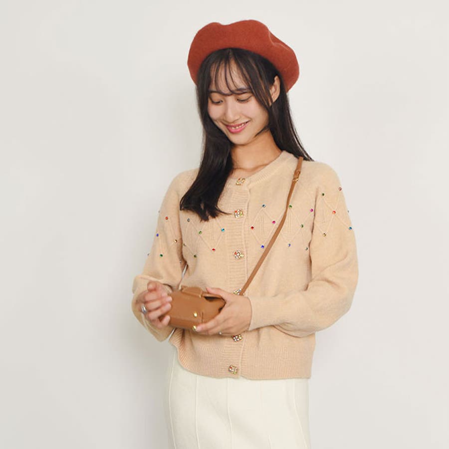 エレガントなデザインが際立つ、カラフルなビジューボタンが特徴のニットカーディガンです。
