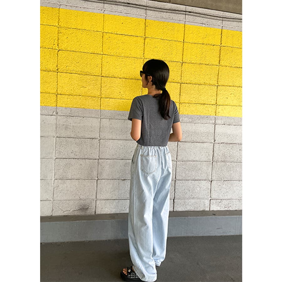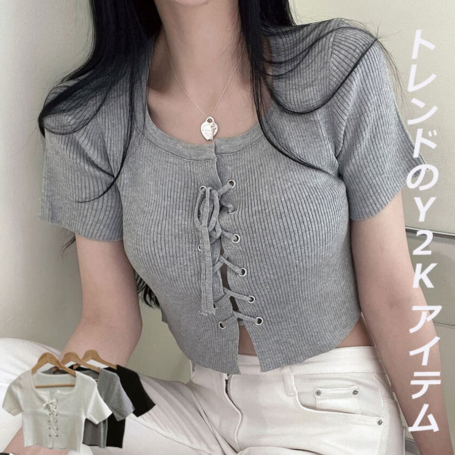 【チャコール】Tシャツ半袖レディース レースアップ半袖バレエコアリブニット クロップド丈