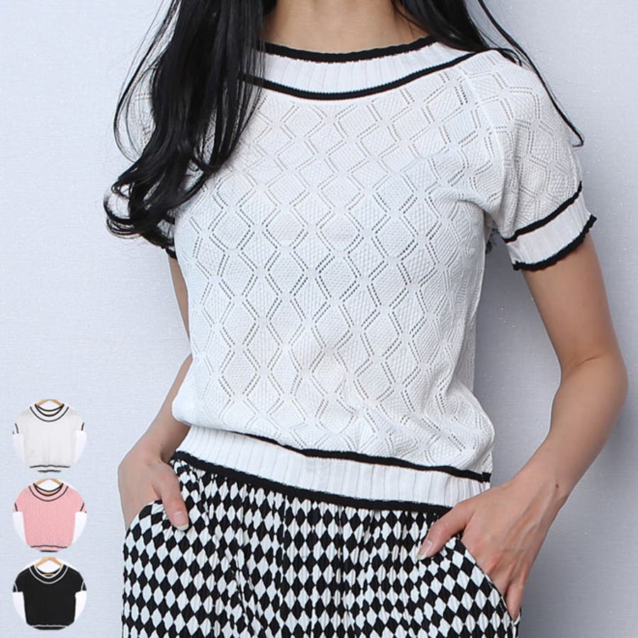 ダイヤ柄配色ボートネック半袖ニット ショート丈 トップス