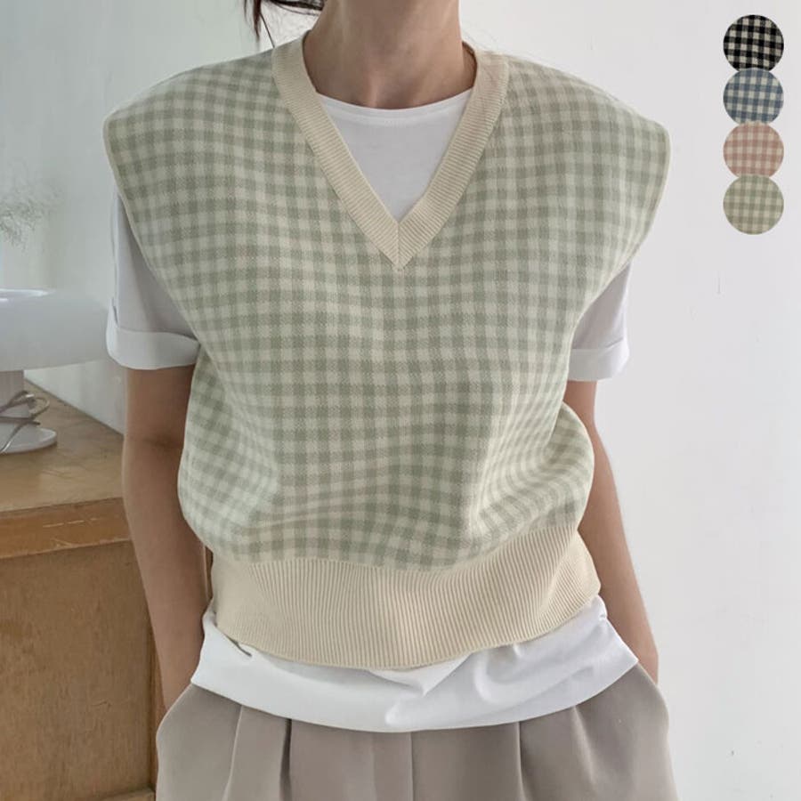 チェックパターンニットベスト レディース 華やかなカラー感のニットベスト 可愛い vネックニット 韓国 秋 デイリー スタイリッシュノースリーブニット チェック トップス vネック ニットベスト カットソー 秋 チェック kndo0964