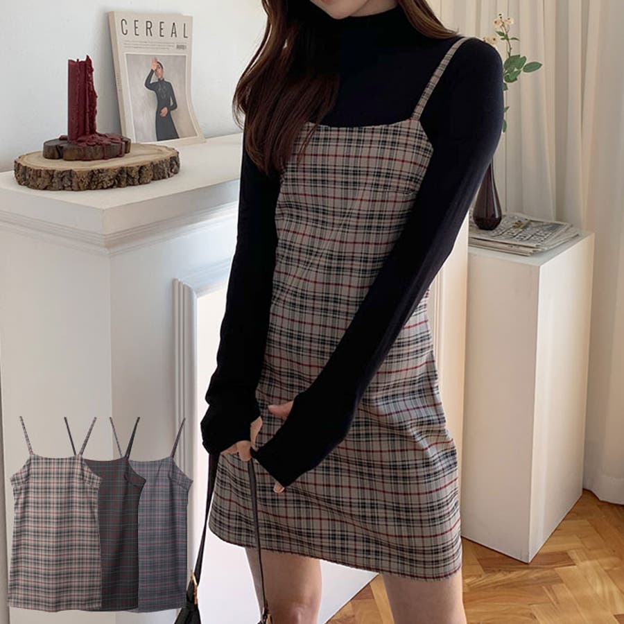 秋冬らしいチェック柄を使ったシンプルなキャミソールワンピース。