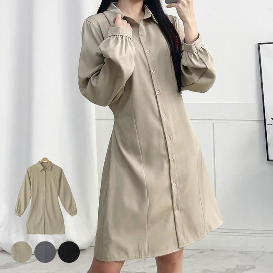 【チャコール】ボリューム袖シャツミニワンピース 全3色 長袖