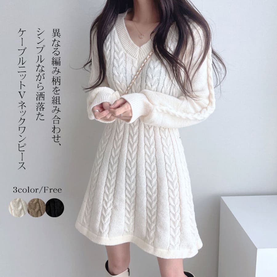 Vネックニットワンピースショート丈 レディース ケーブルニット