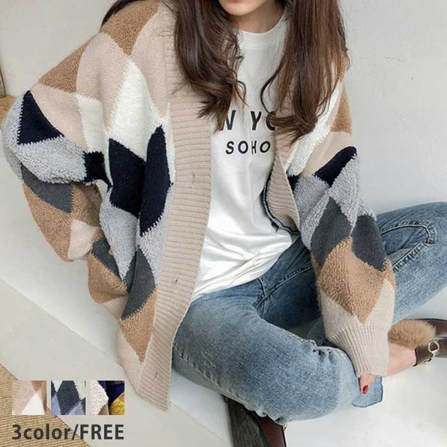 パイルとニットのミックス素材のアーガイル柄ニットカーディガン