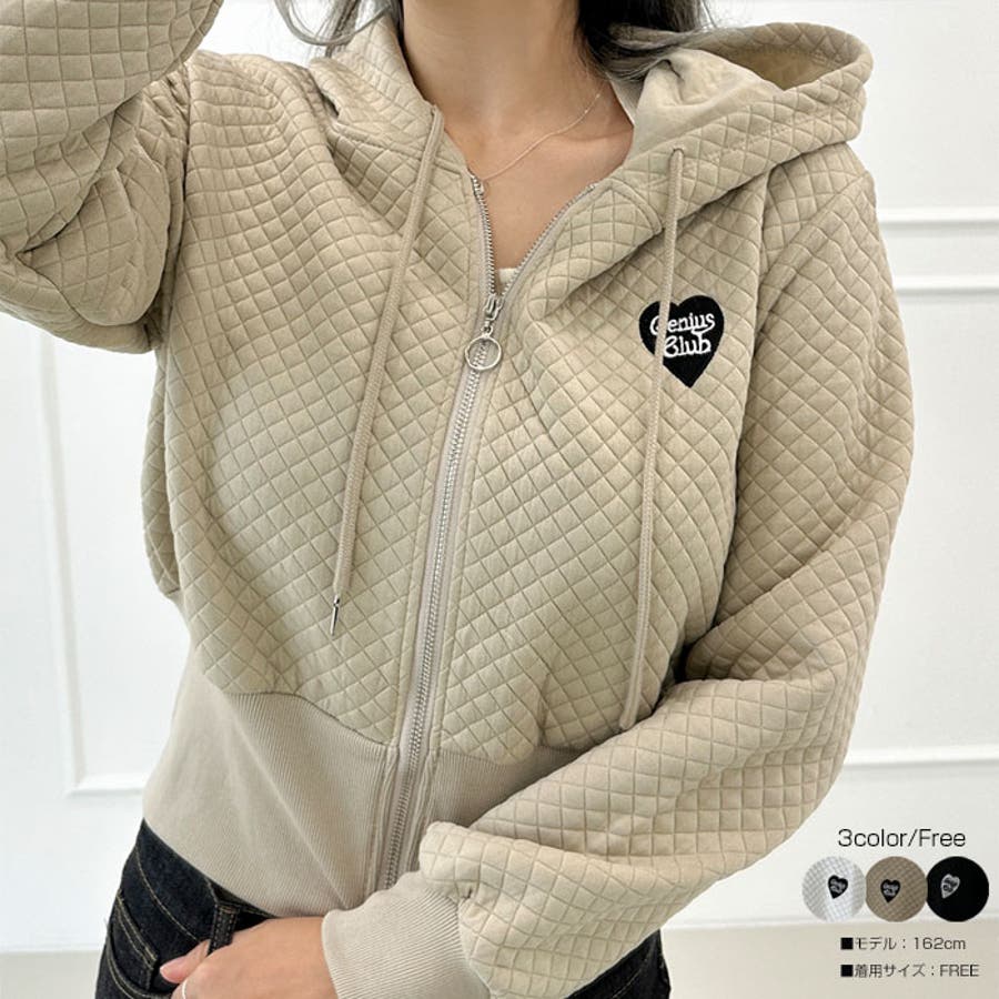 ファスナーの金具は円になっており、胸元のハートがカジュアルさの中にかわいらしさのあるデザインです。