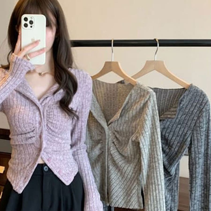 リブカーディガン シャーリングデザイン リブトップス フィット感 カーディガン 韓国ファッション シンプル カジュアル デイリー スタイルアップ 韓国ファッション