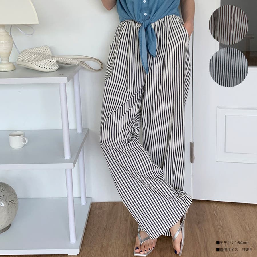 ストライプ柄パンツ夏ワイドパンツ レディース ボトムス