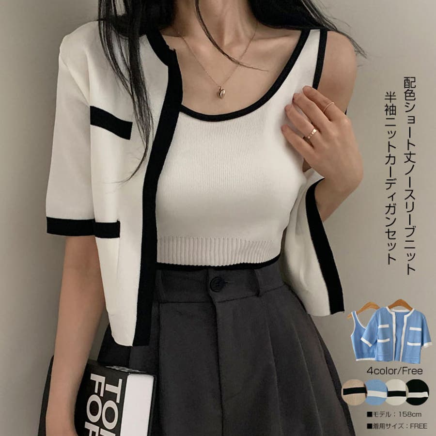 2点セット半袖カーディガン+キャミソール ショート丈 Y2K 配色 セットアップ 韓国 春夏 半袖カーディガン キャミソール 配色 アンサンブル 可愛い レディース ショート丈 ニットセット 半袖 セットアップ 韓国 デイリー 2点セット sedo0443