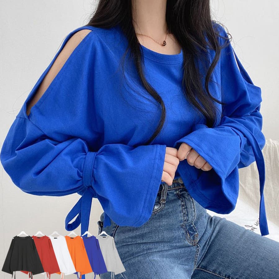 トップス レディース 春 肩スリット 袖リボン トップス 長袖 韓国 tシャツ 長袖 レディース 肩スリット トップス 袖リボン カットソー レディース 春 肩スリット カットソー tsdo1206