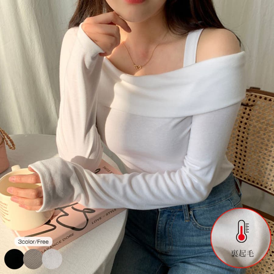 裏起毛肩出しショート丈長袖トップスレディース Y2K 春秋冬