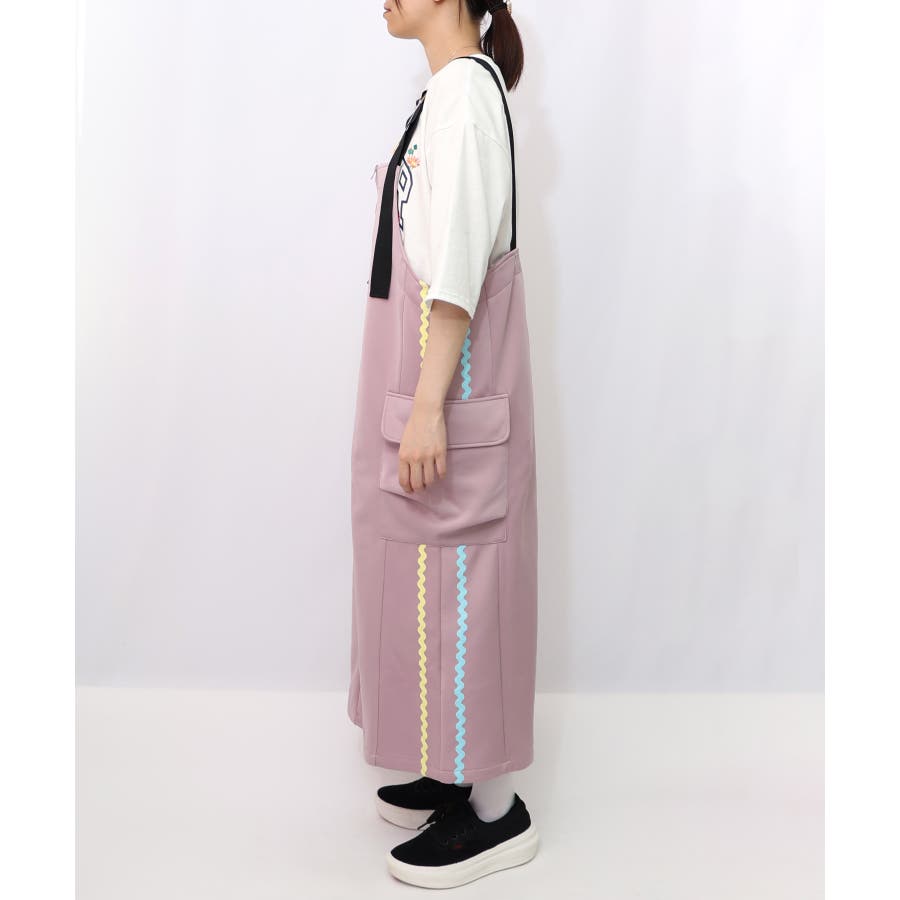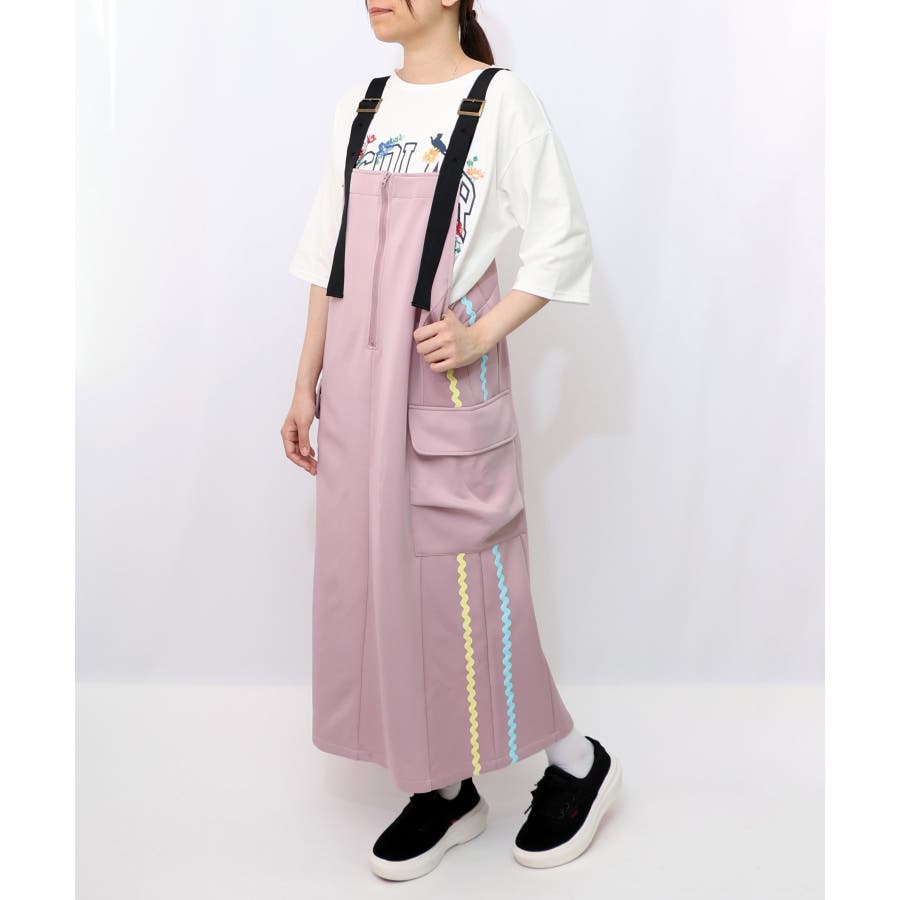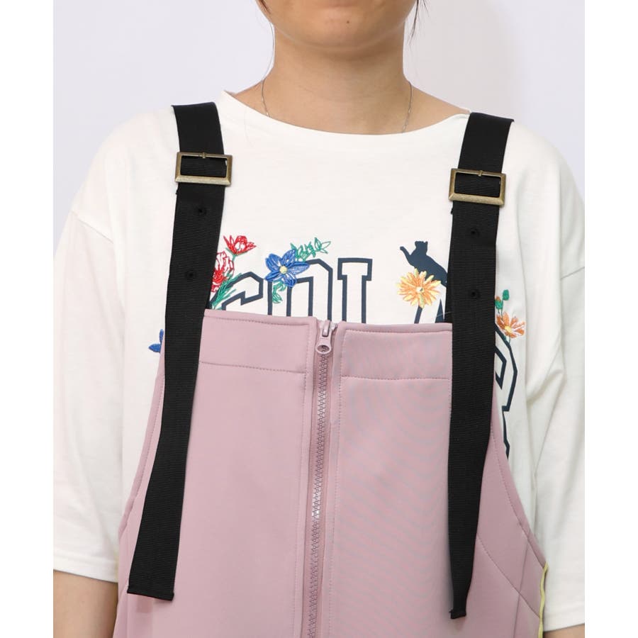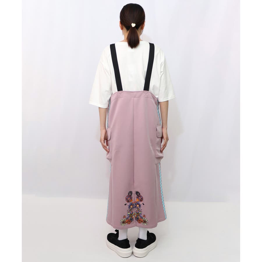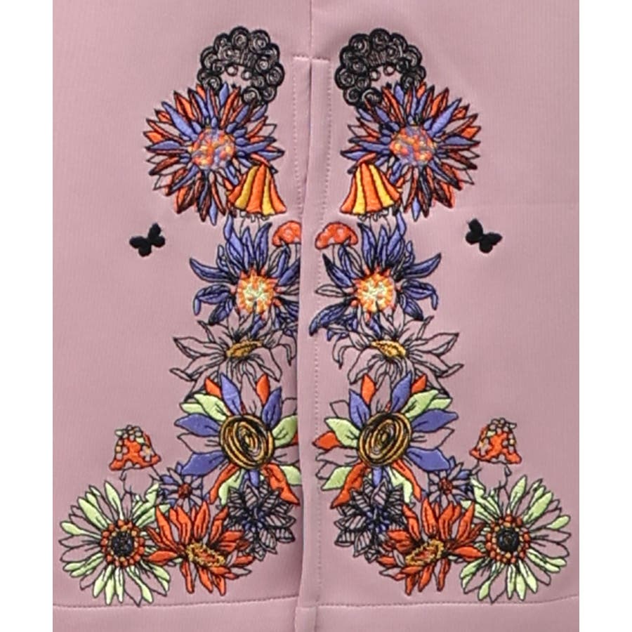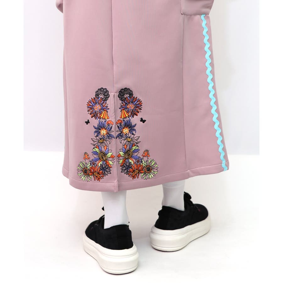 サイドに取り付けられた大きなポケットや、後ろ身頃の裾に施されたお花刺繍が