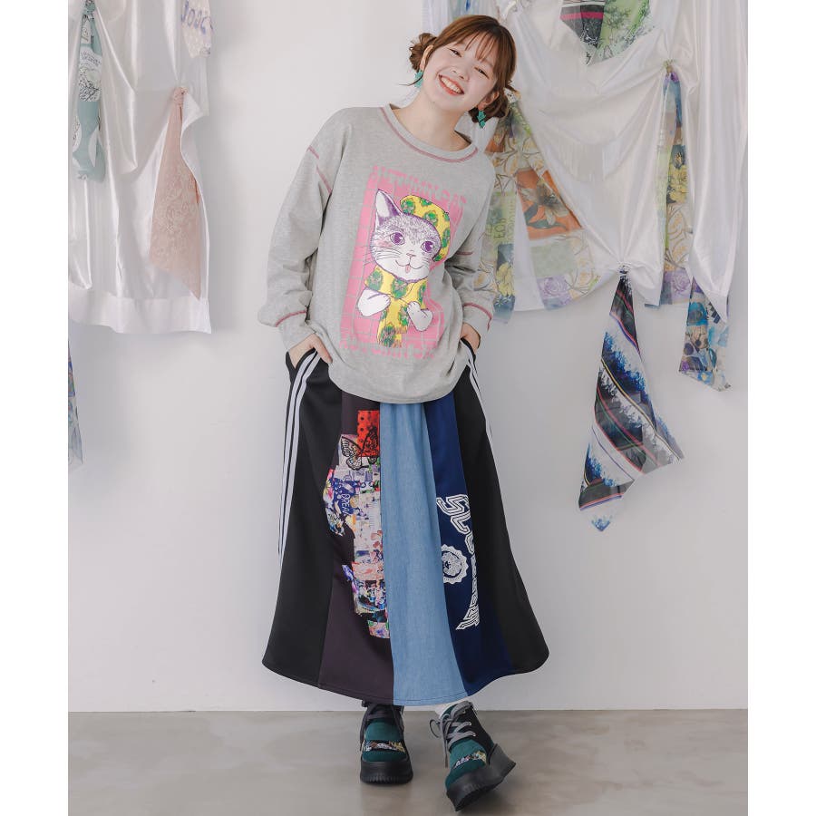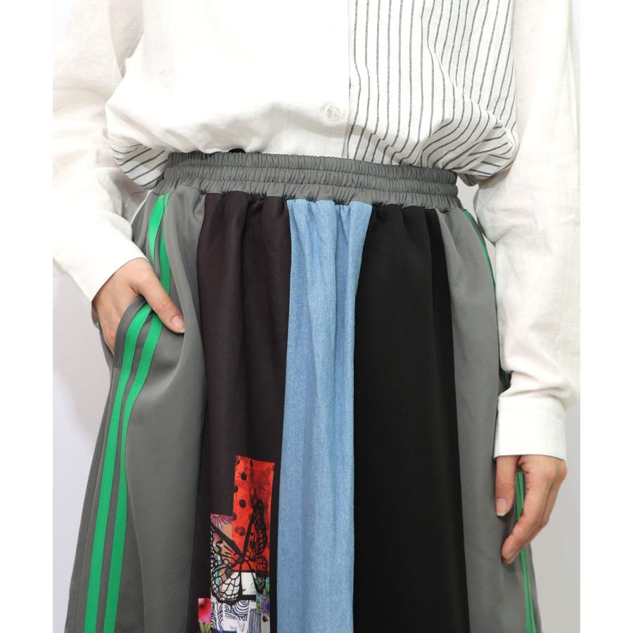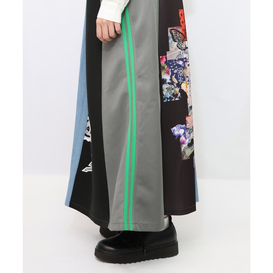ロゴコラージュ柄 デニム×ジャージ切替スカート