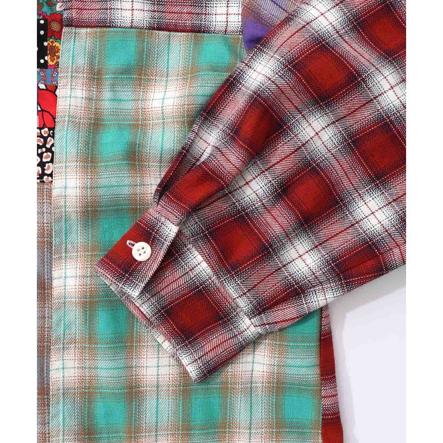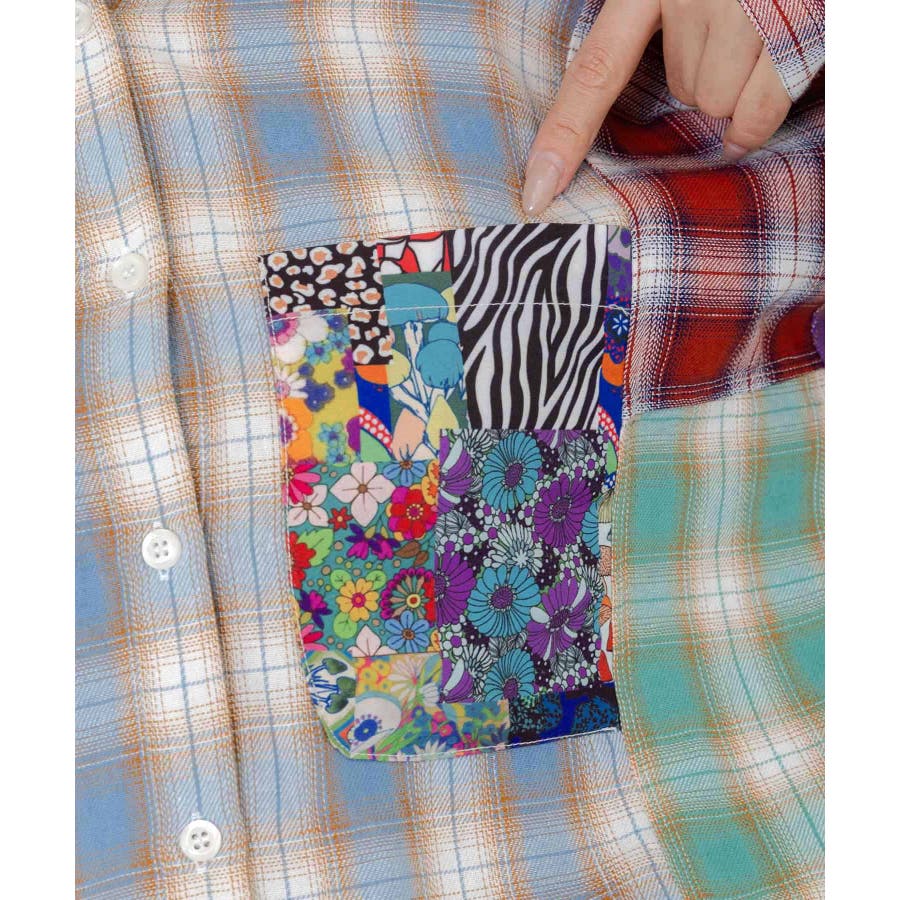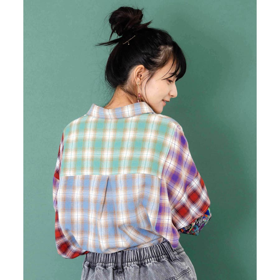 右袖は色違いチェック×総柄を重ねたフリルのティアード、左袖はふんわりシルエット、