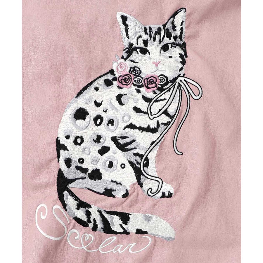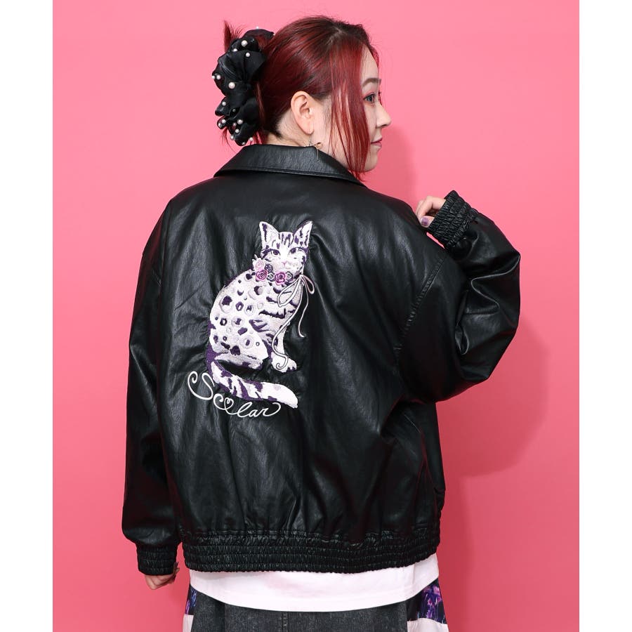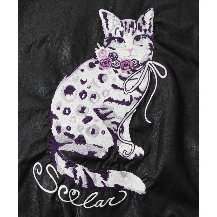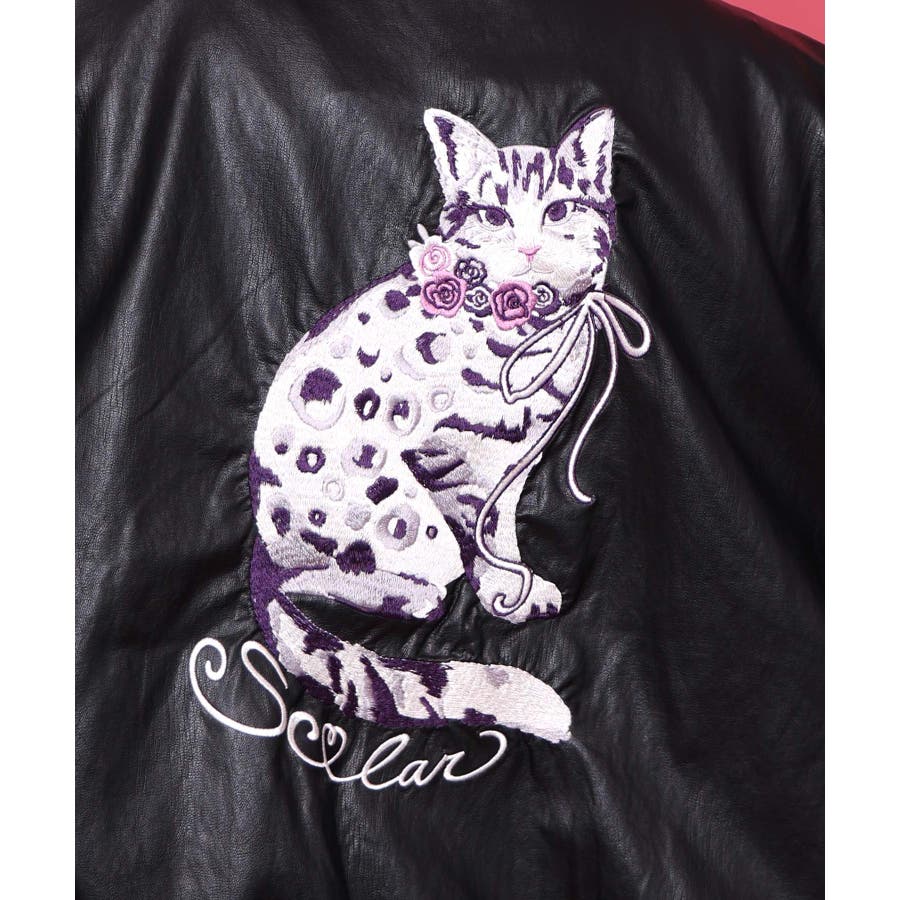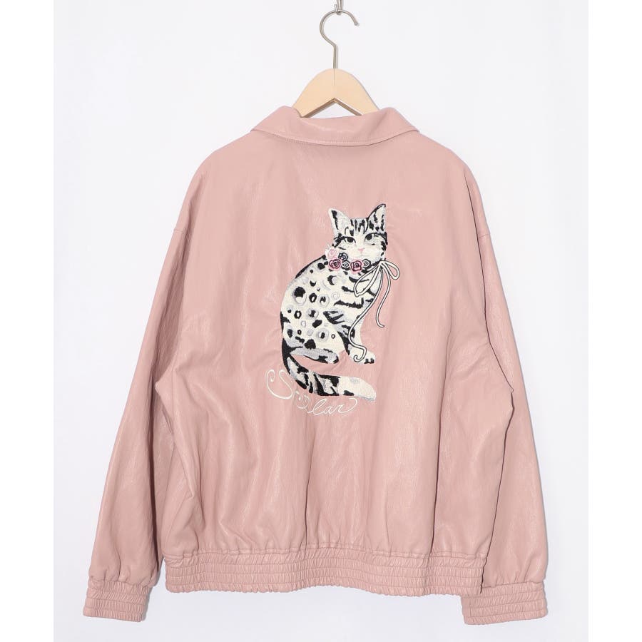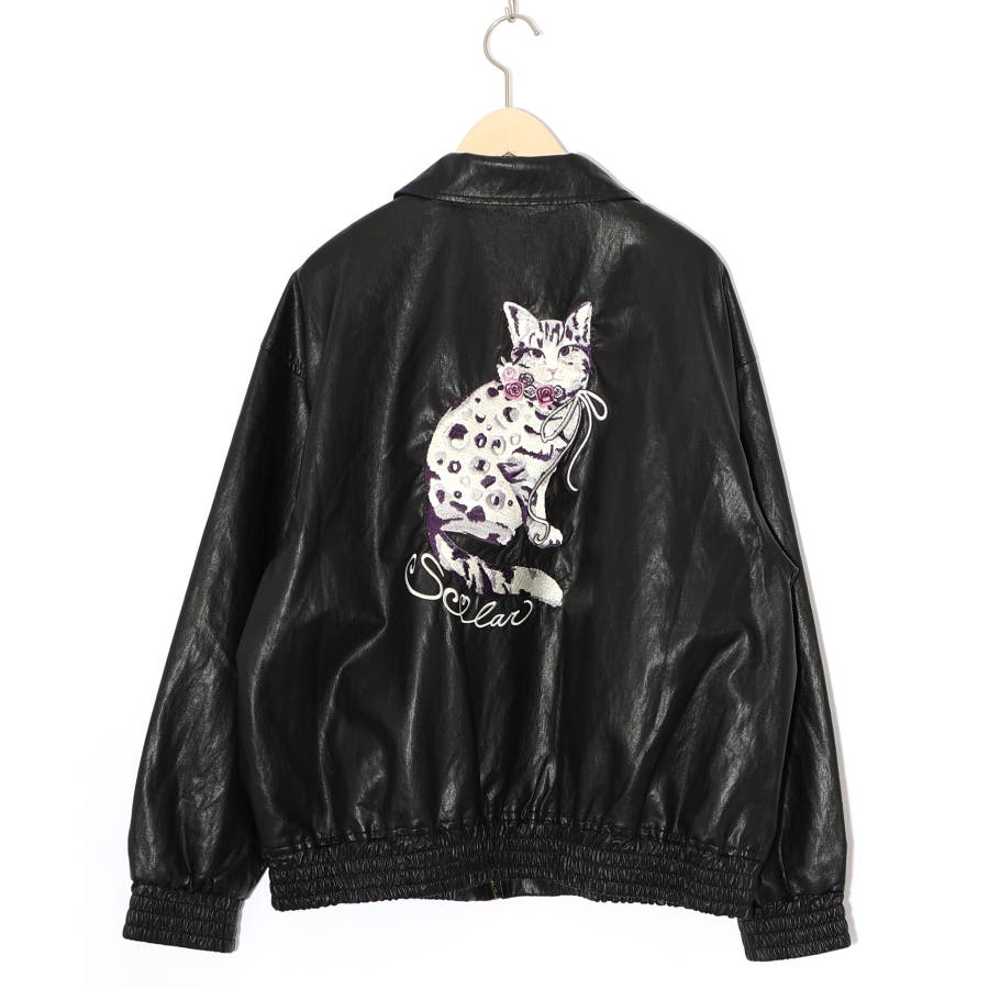 ネコ刺繍フェイクレザー×裏地ブルゾン
