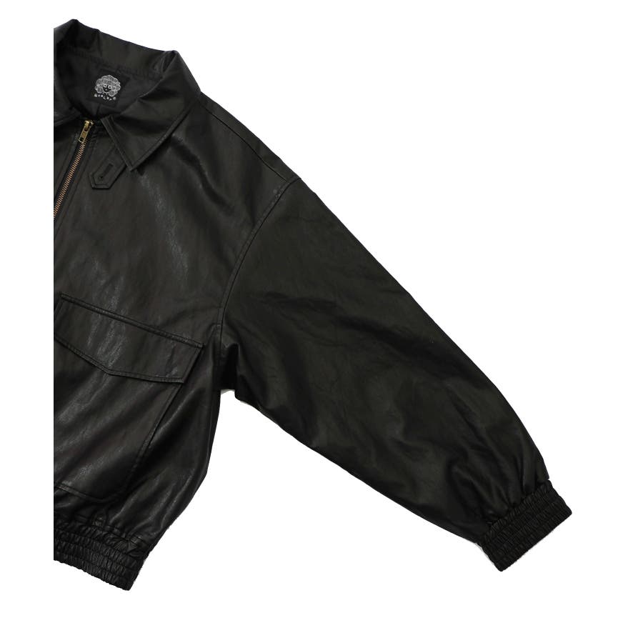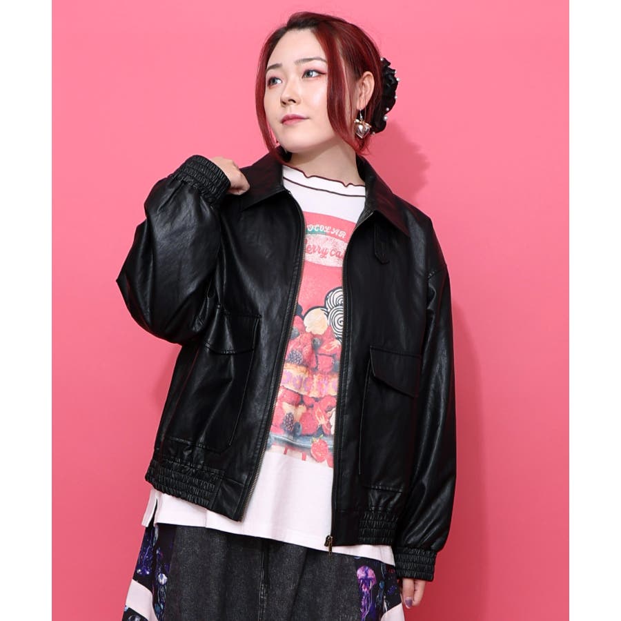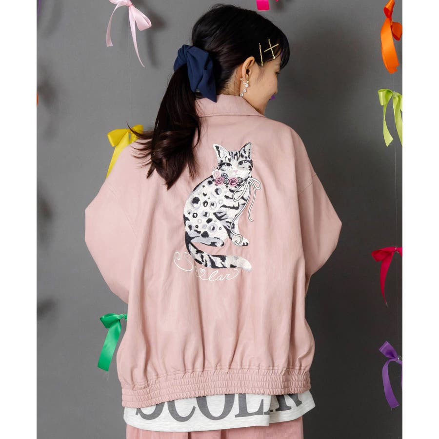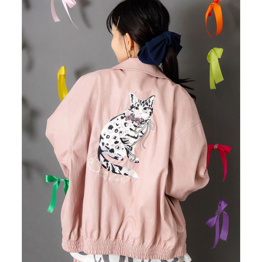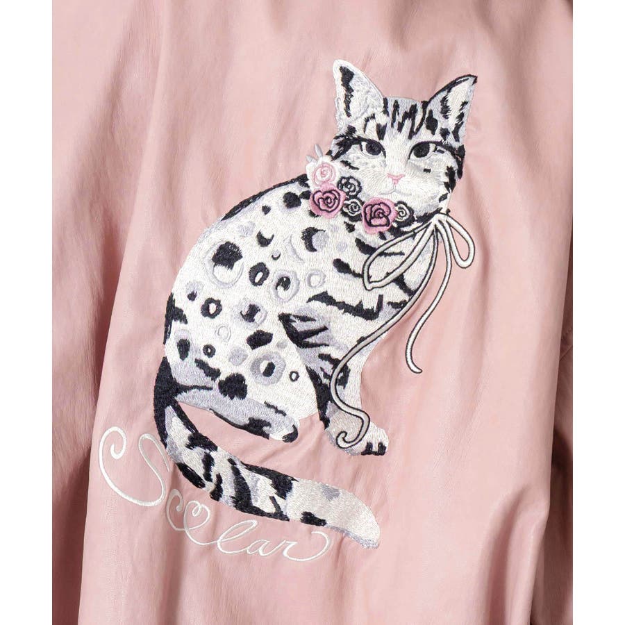 ネコ刺繍フェイクレザー×裏地ブルゾン