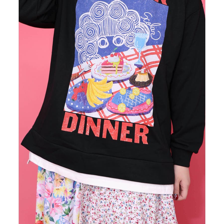 少しアメリカンチックでポップな「ディナー」をテーマにしたプリントが、コーディネートの主役に。