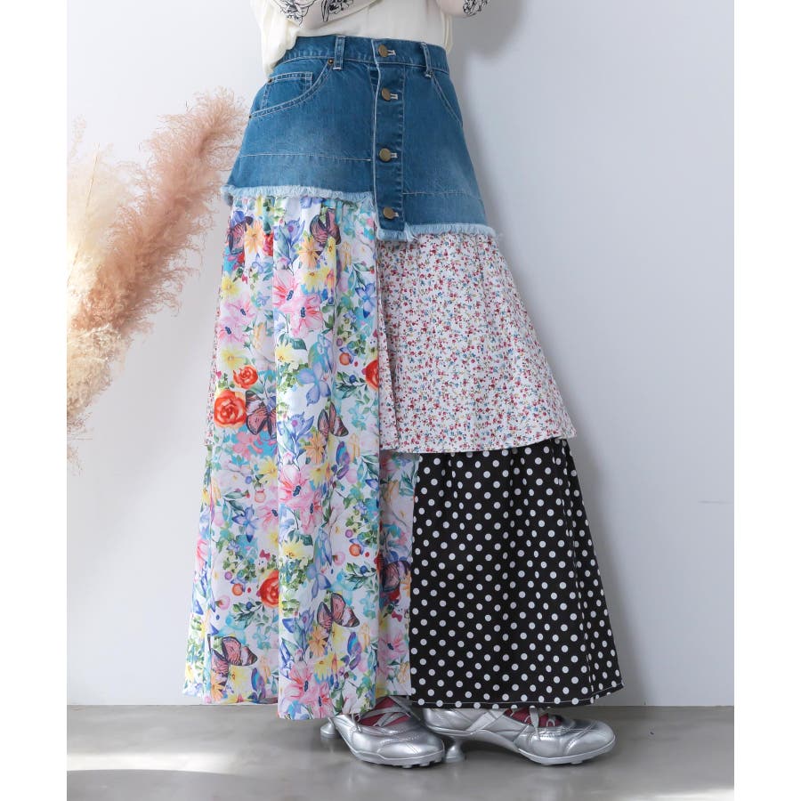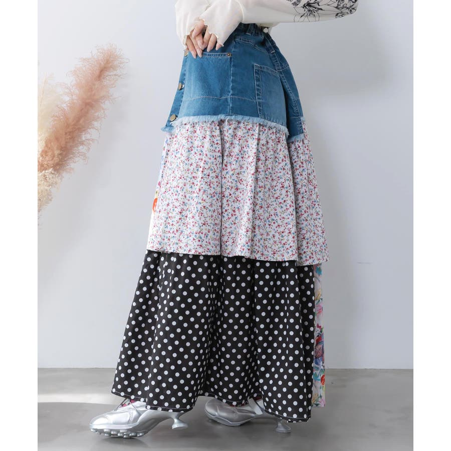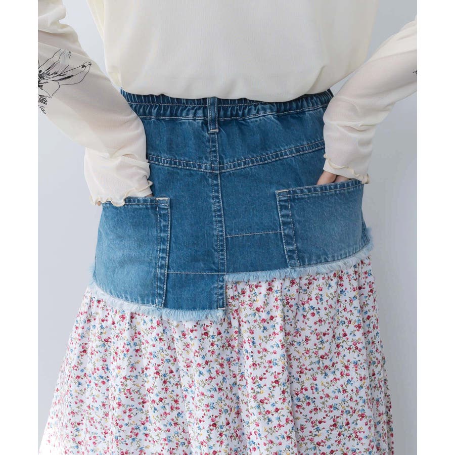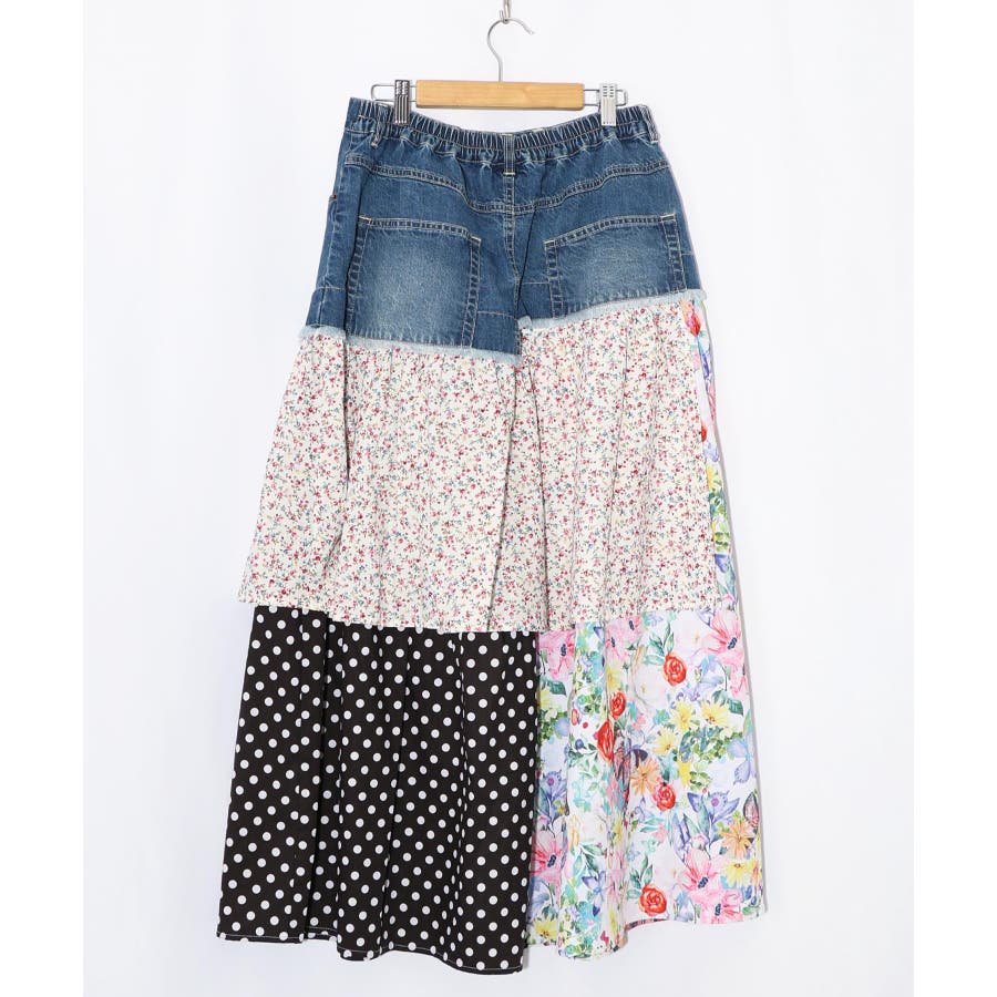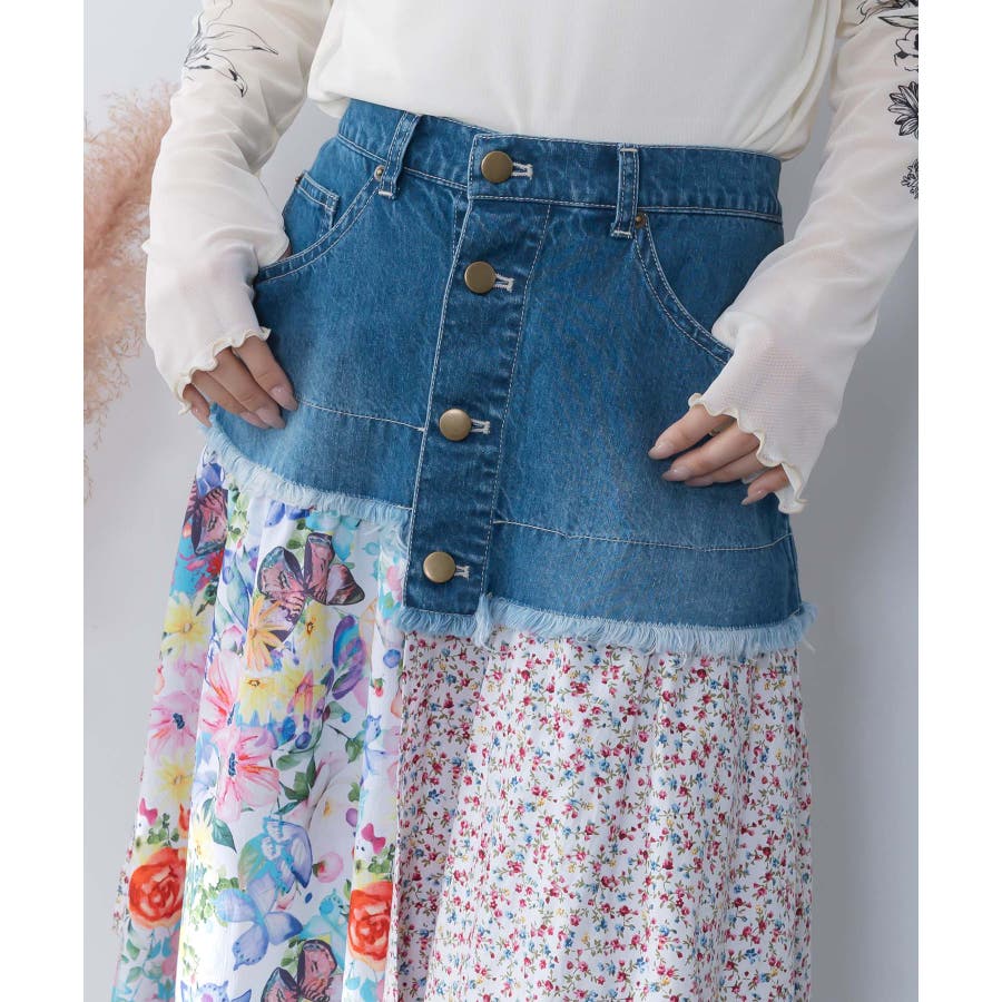 デニム×パッチワーク風 異素材切替2wayスカート