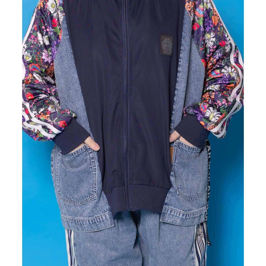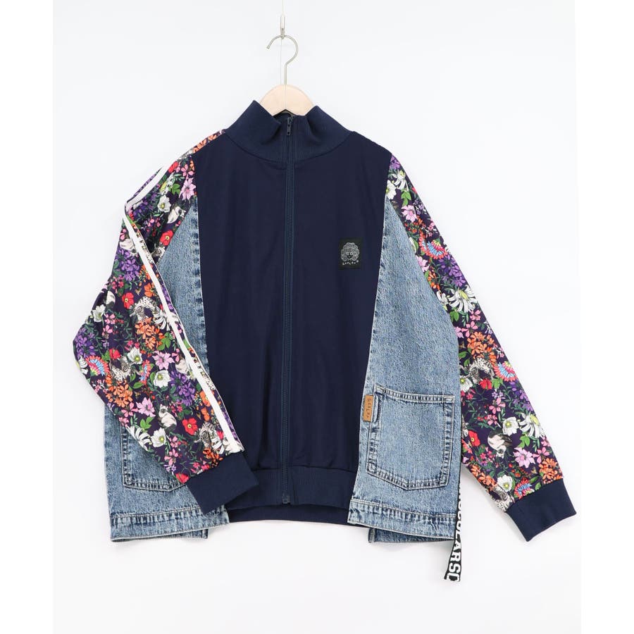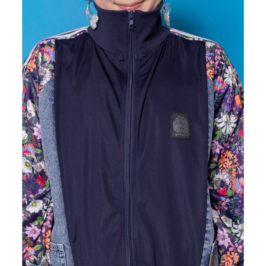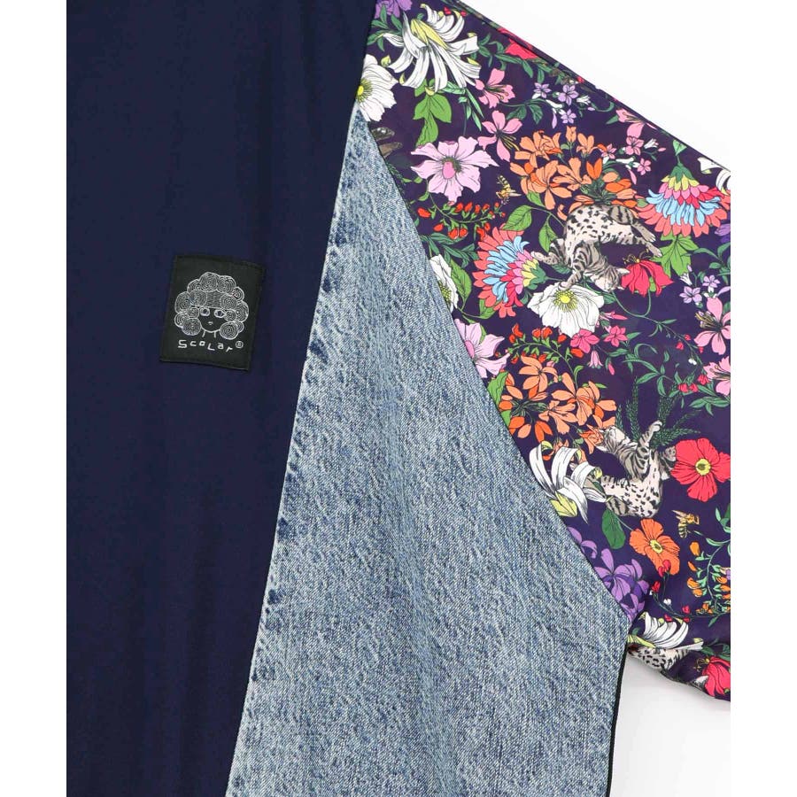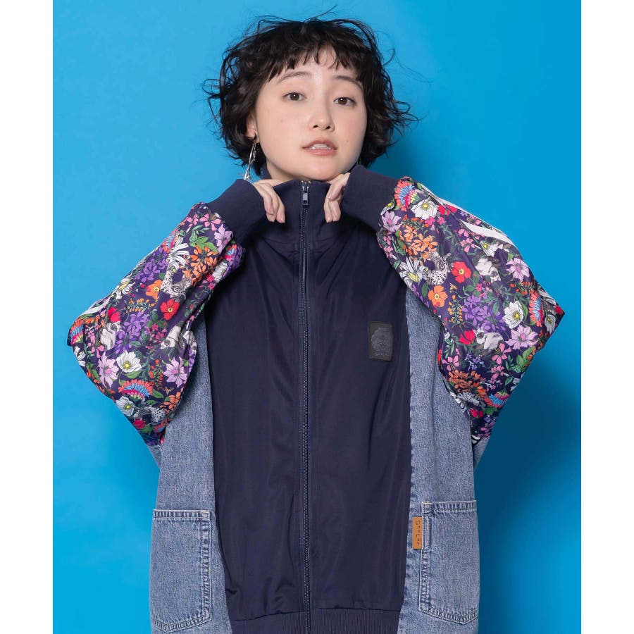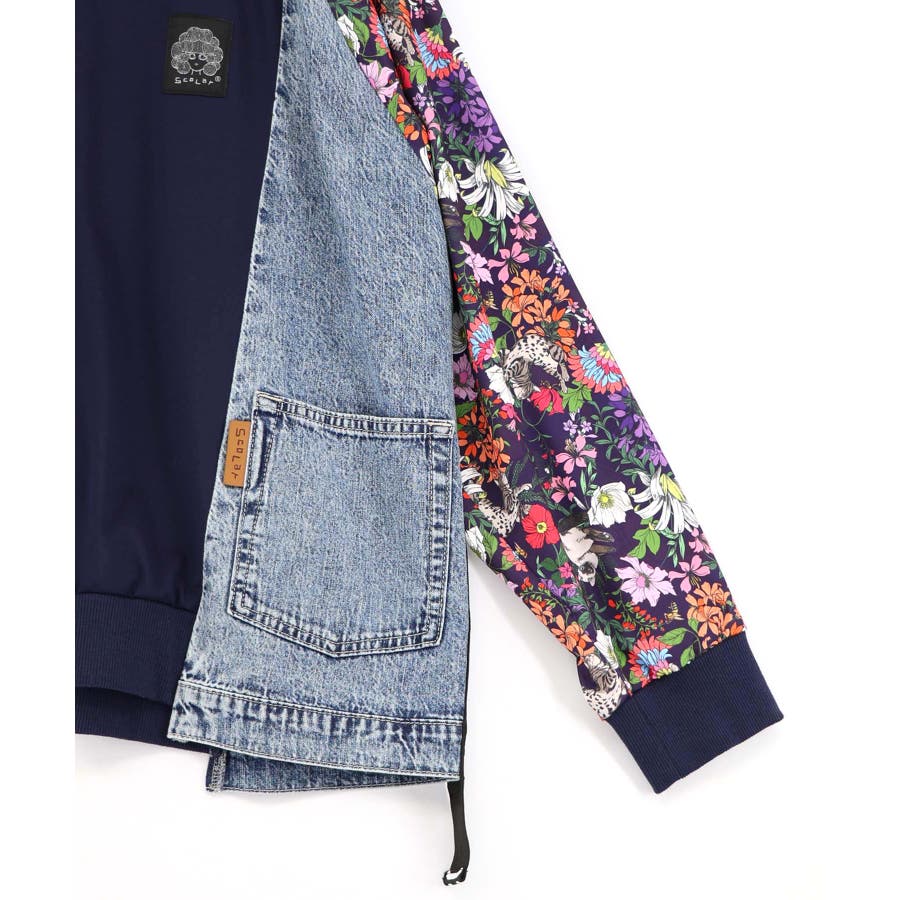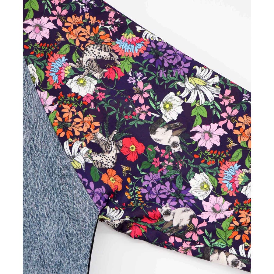 花ネコ柄ジャージ×デニム 異素材切替ブルゾン