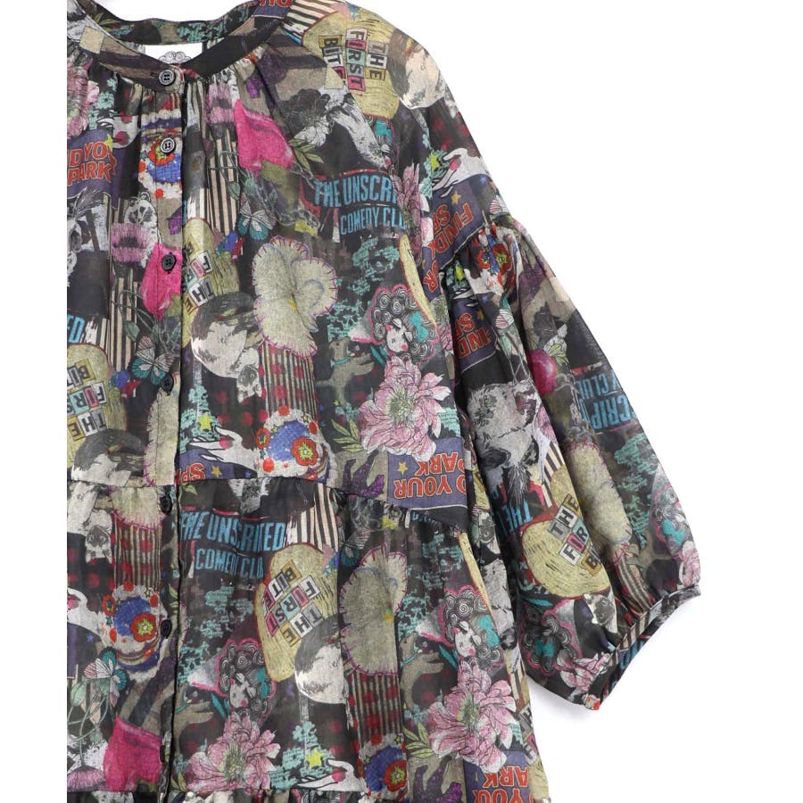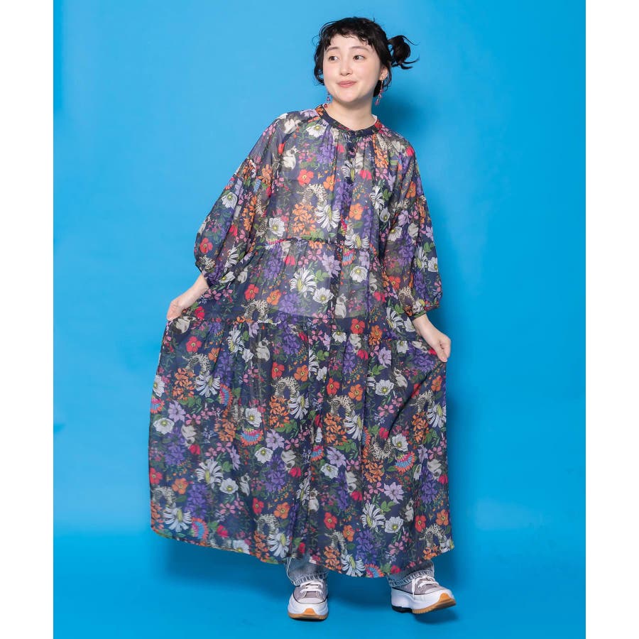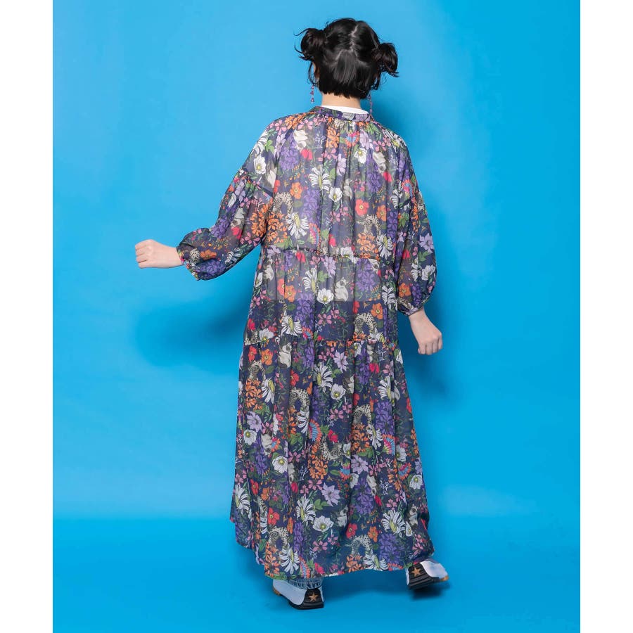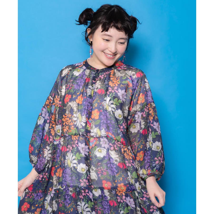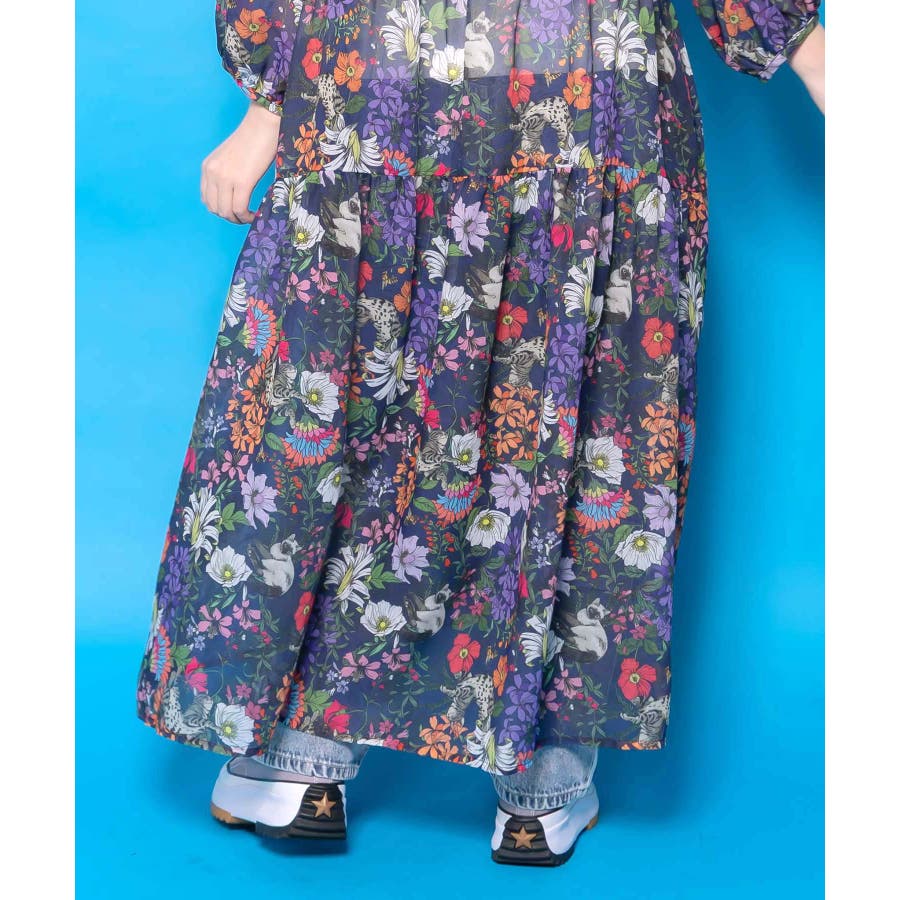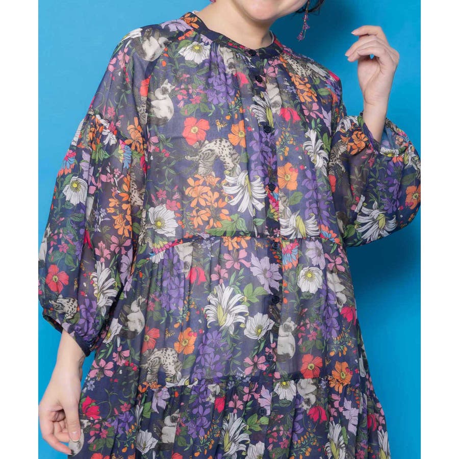 花ネコ柄シアー素材ティアードシャツワンピ