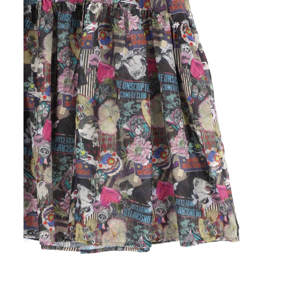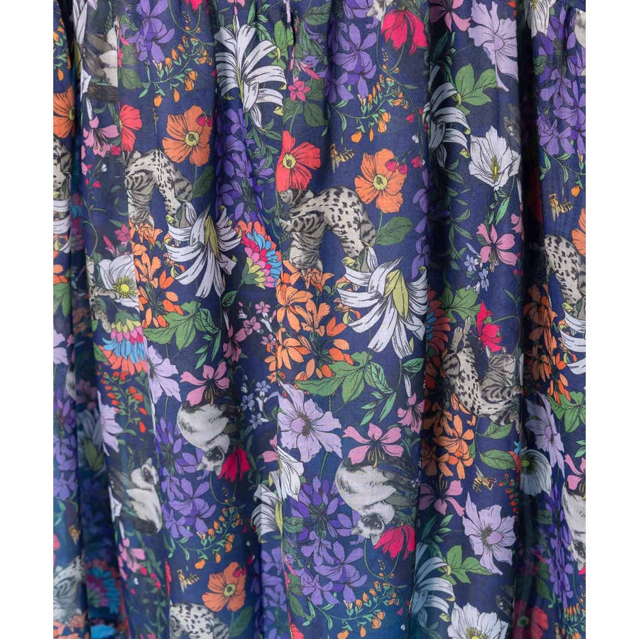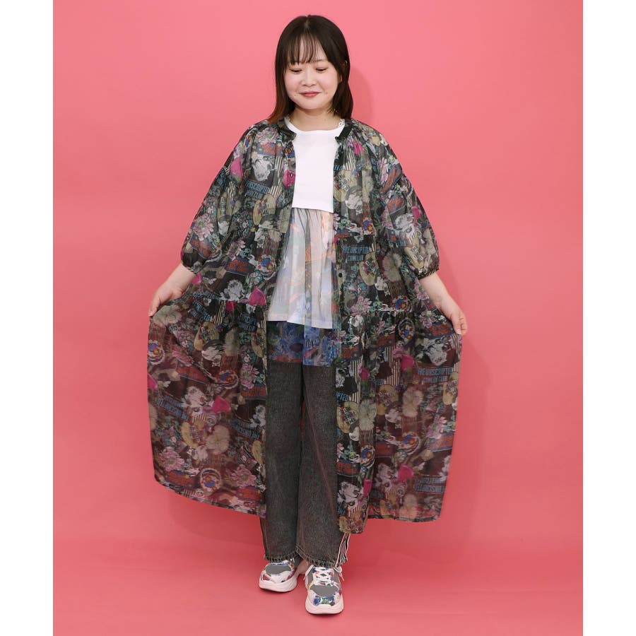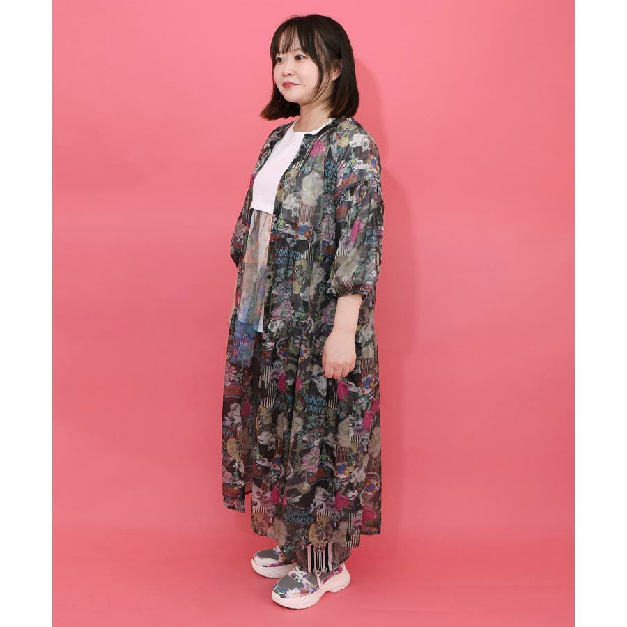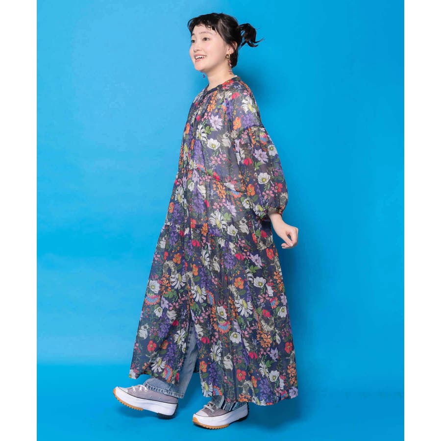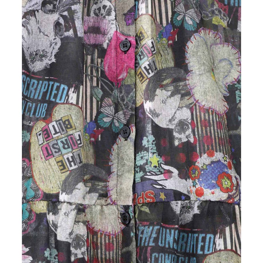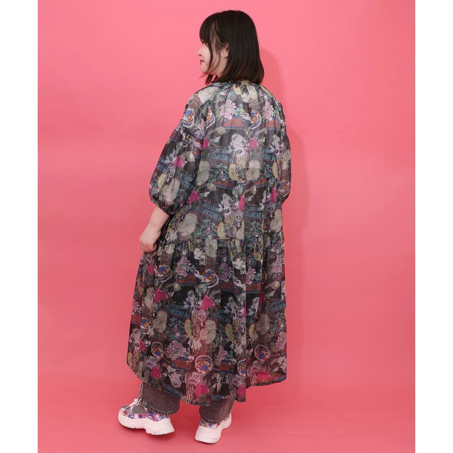 花ネコ柄シアー素材ティアードシャツワンピ