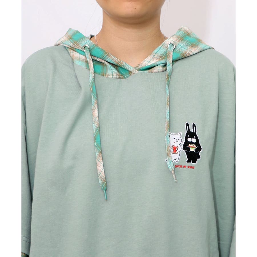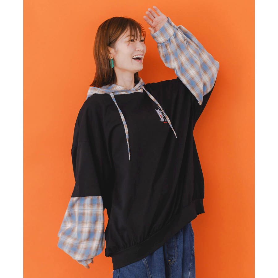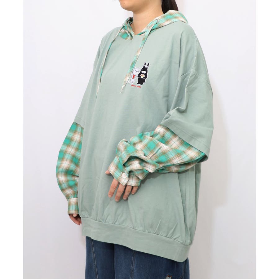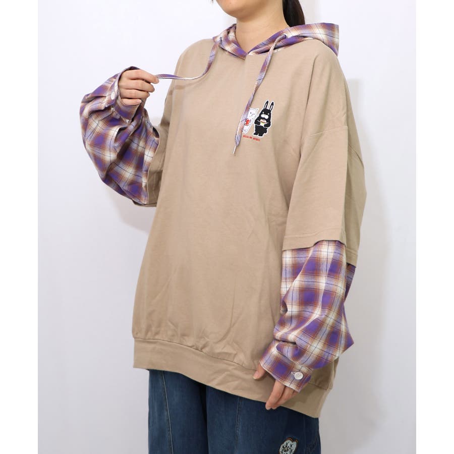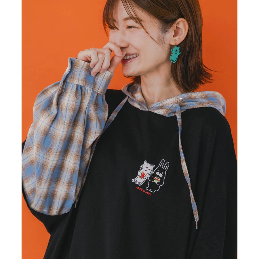 ネコとラビルのチェック柄切替フーデッドプルオーバー