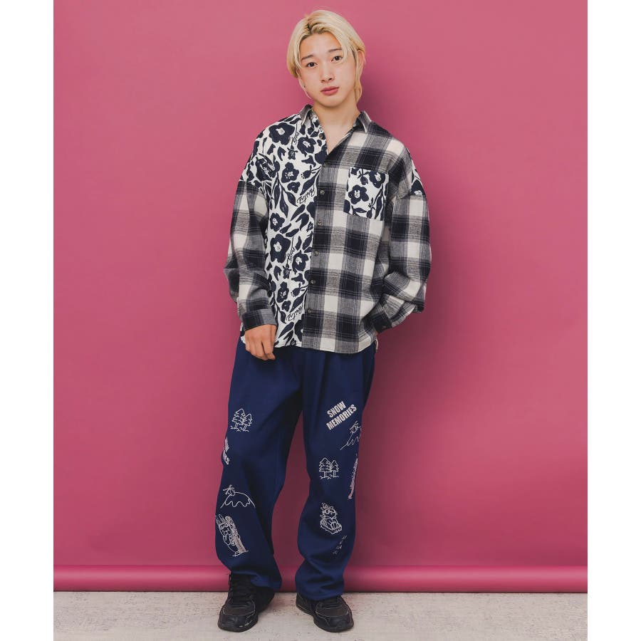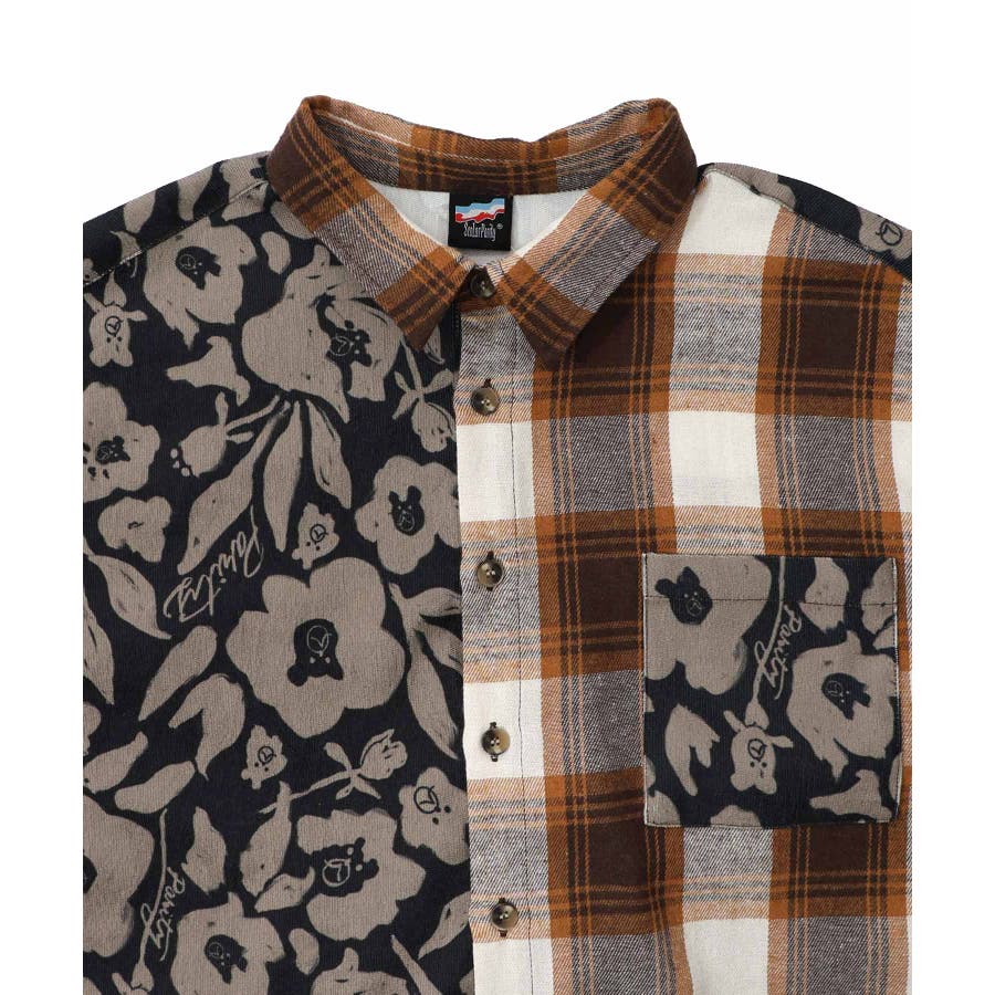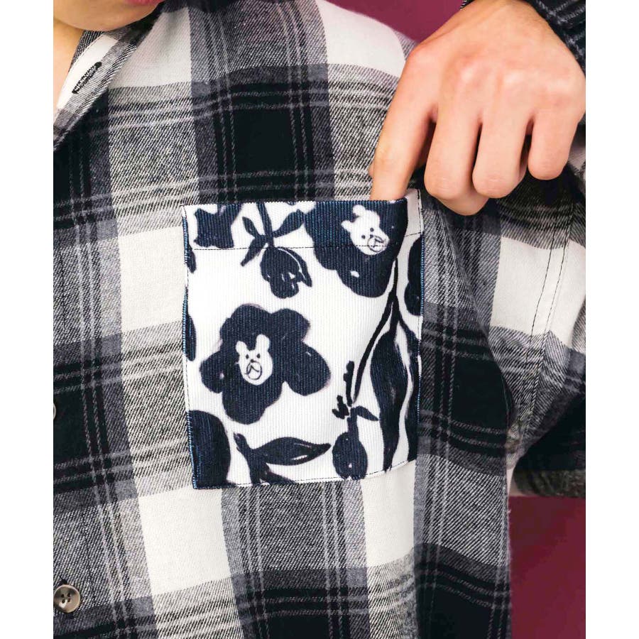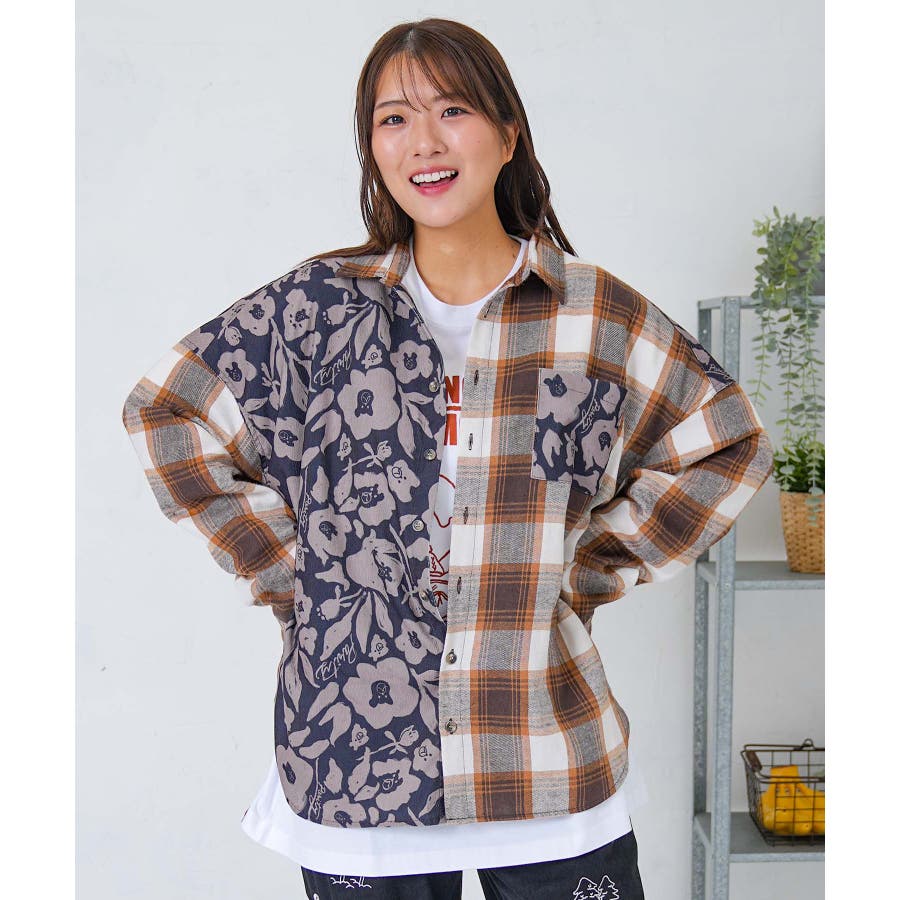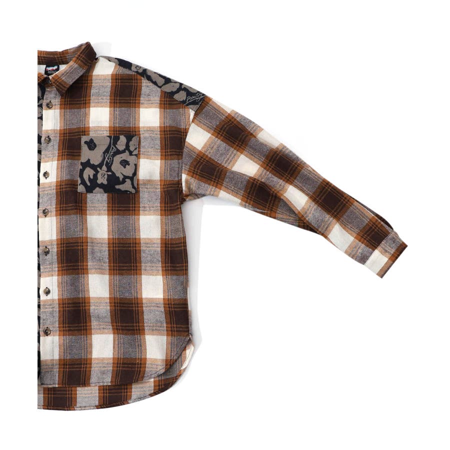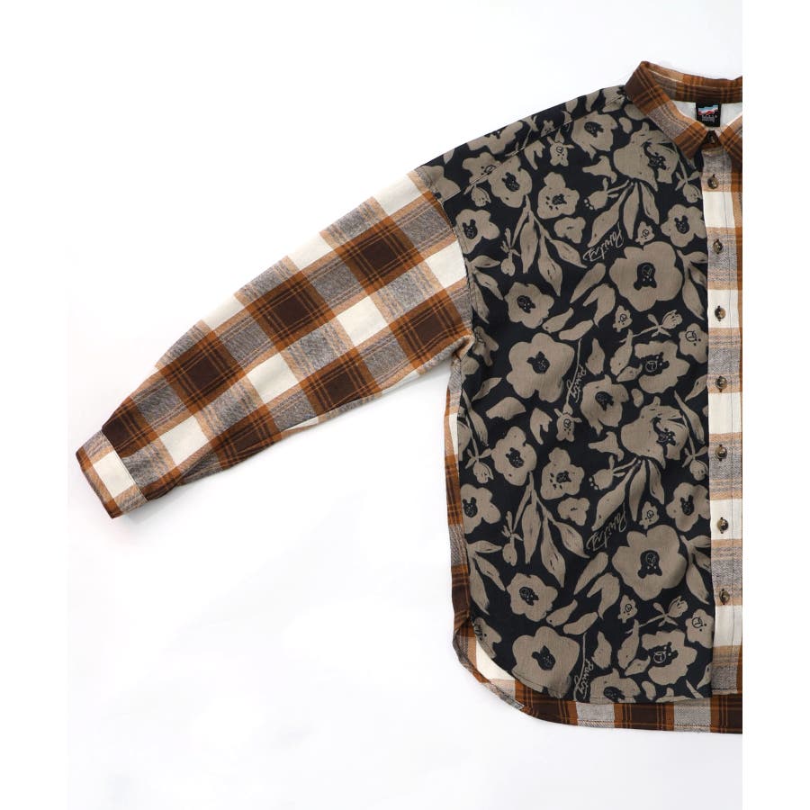 クマ花柄コーデュロイ×チェック異素材切替シャツ
