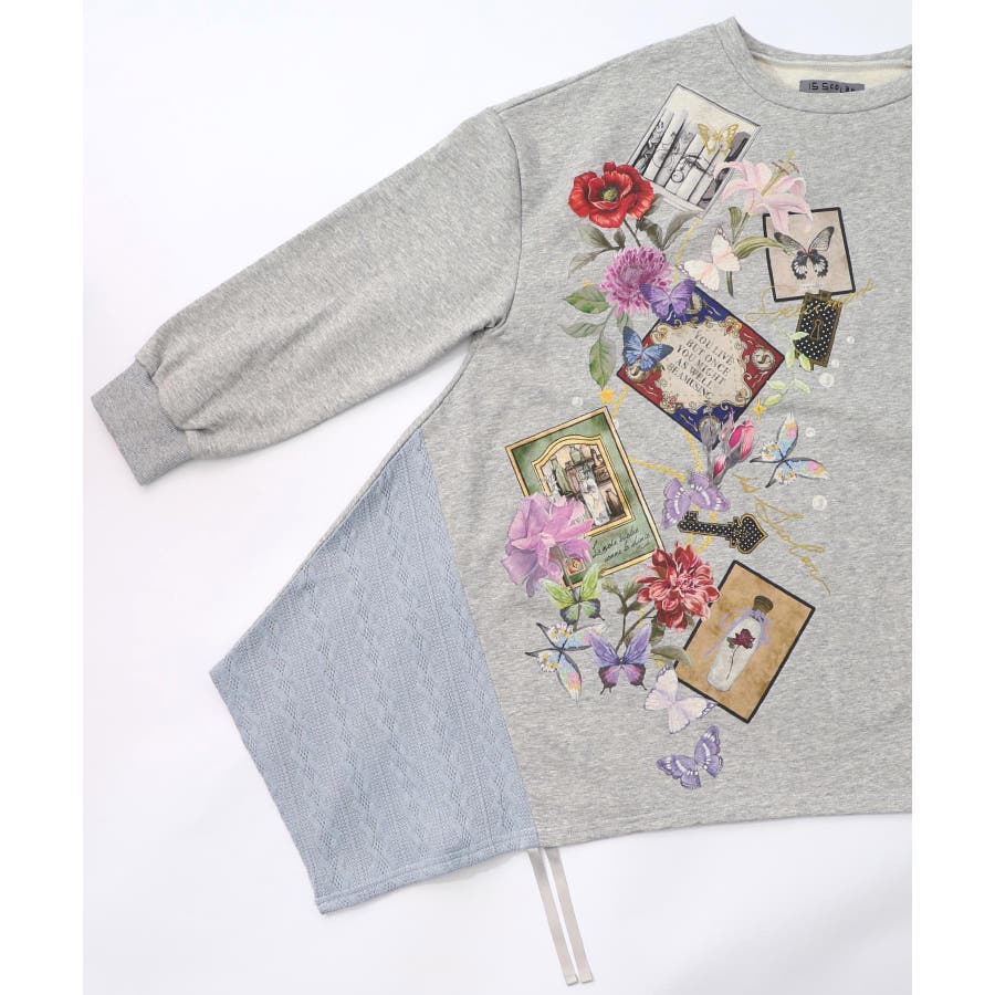 額縁×花×蝶柄 ニットソー×裏毛切替プルオーバー