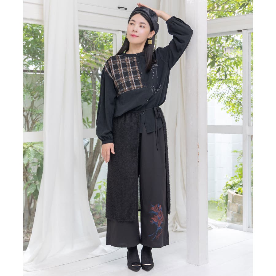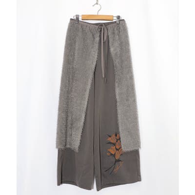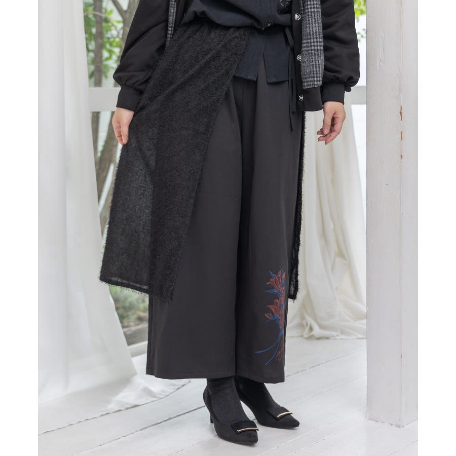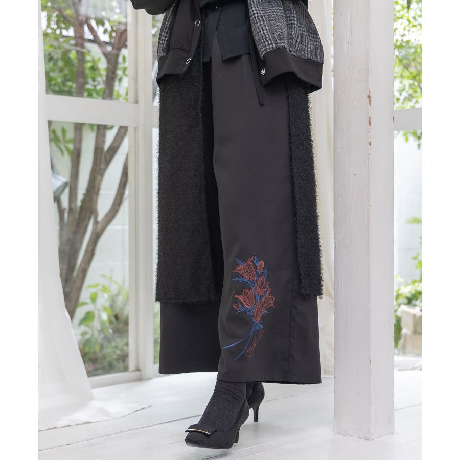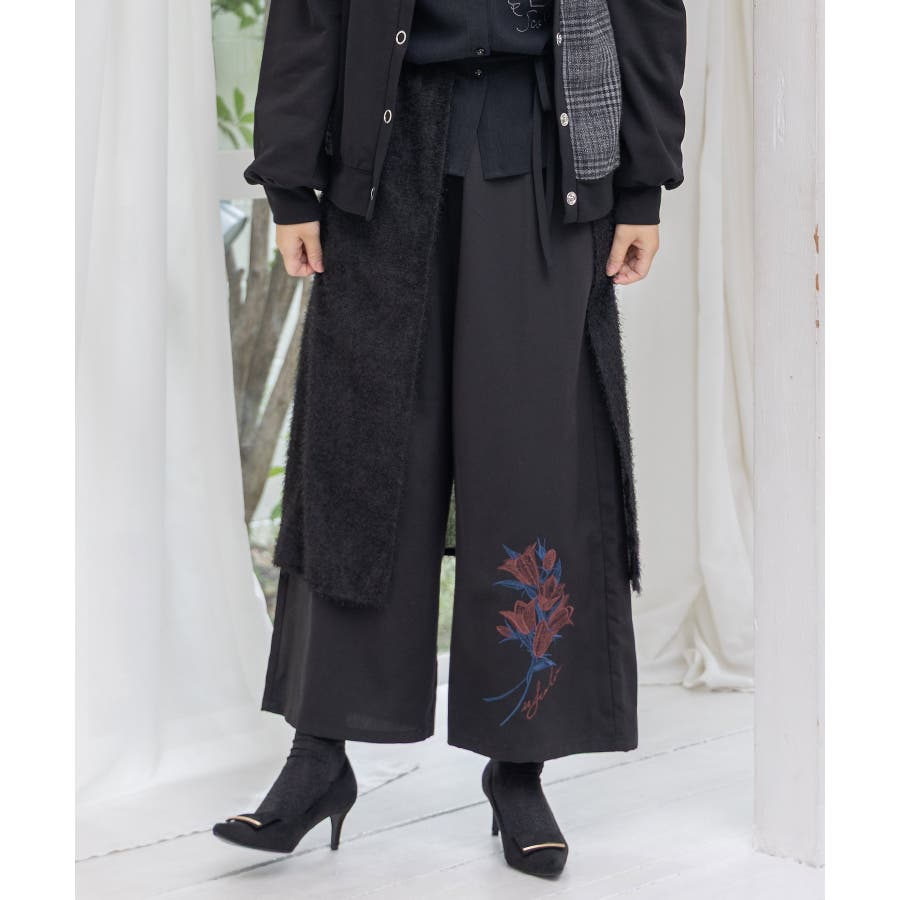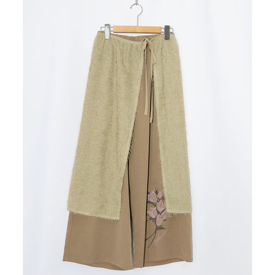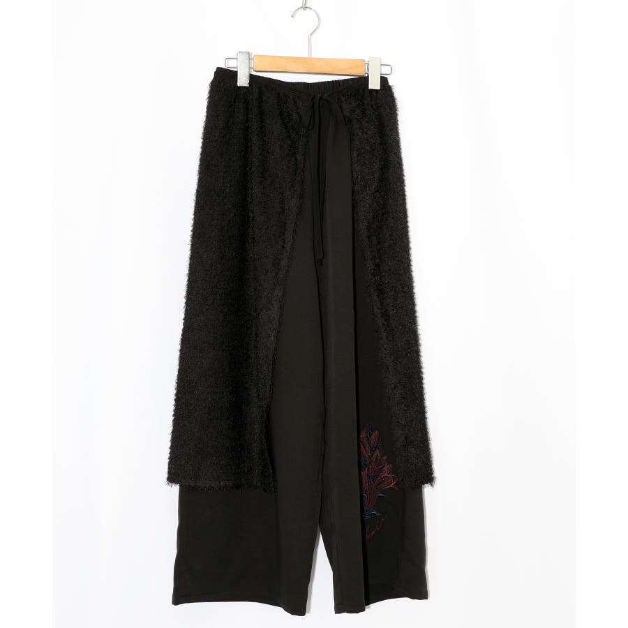 フリンジシフォン巻きスカート付き花刺繍パンツ