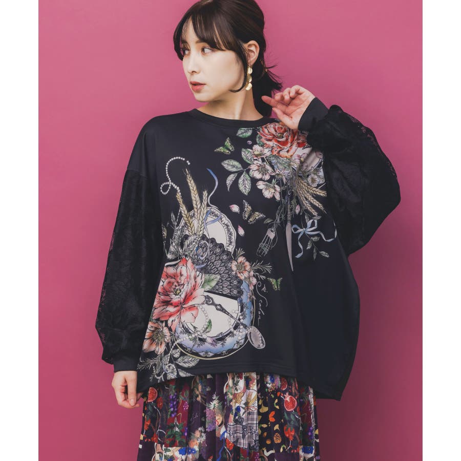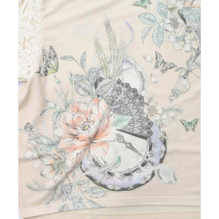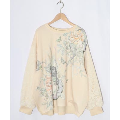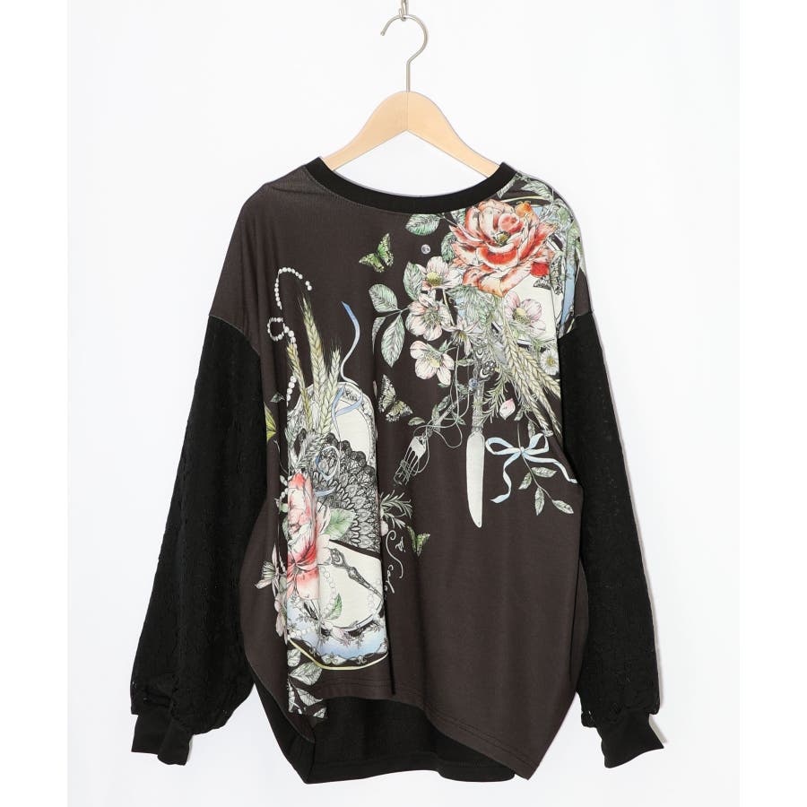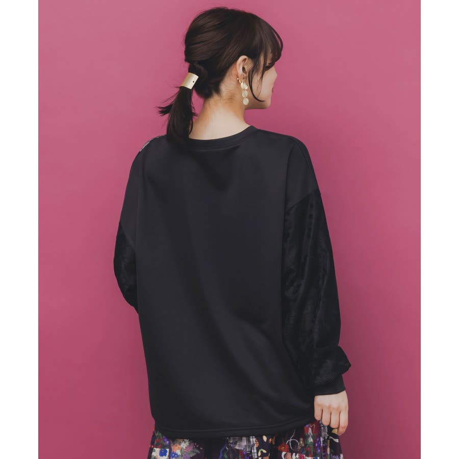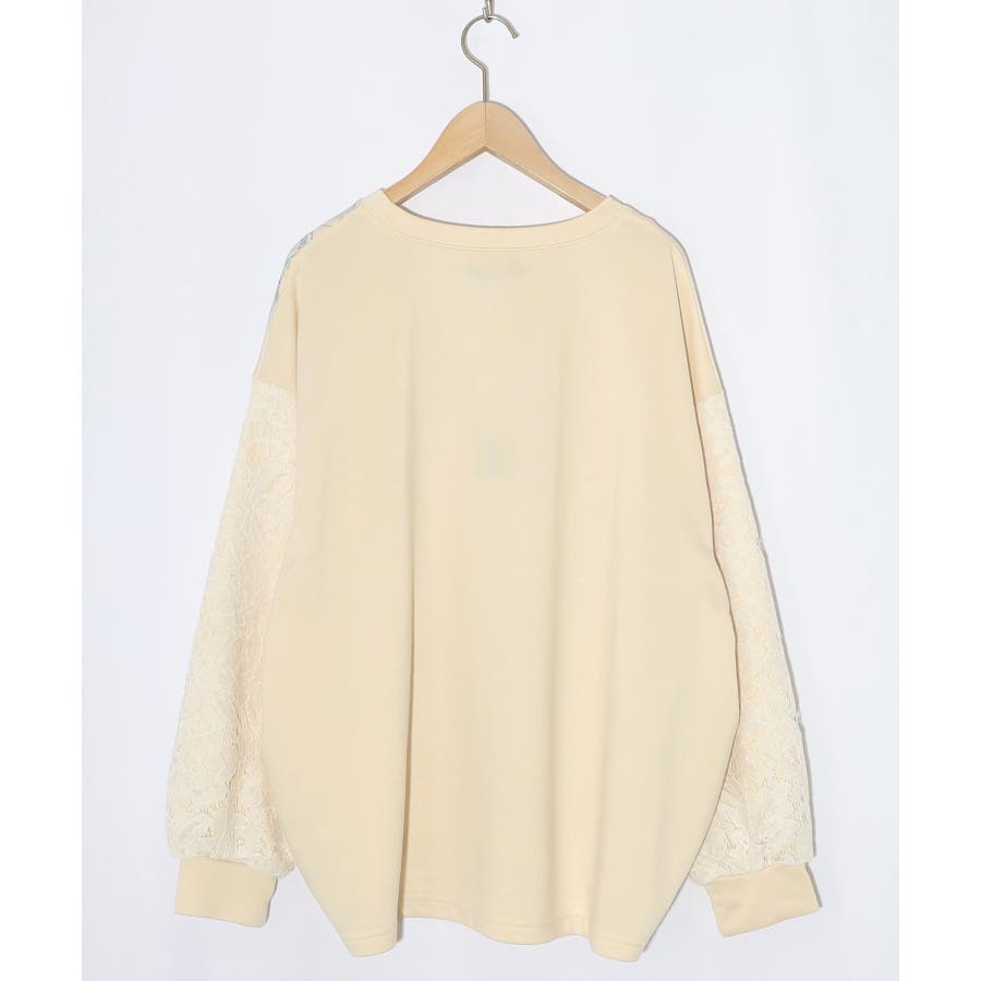 袖にはカットソー生地の上から繊細な花柄レースを重ね、ふわりと優しいフェミニンなデザイン。
