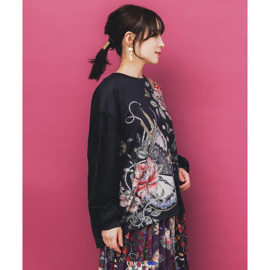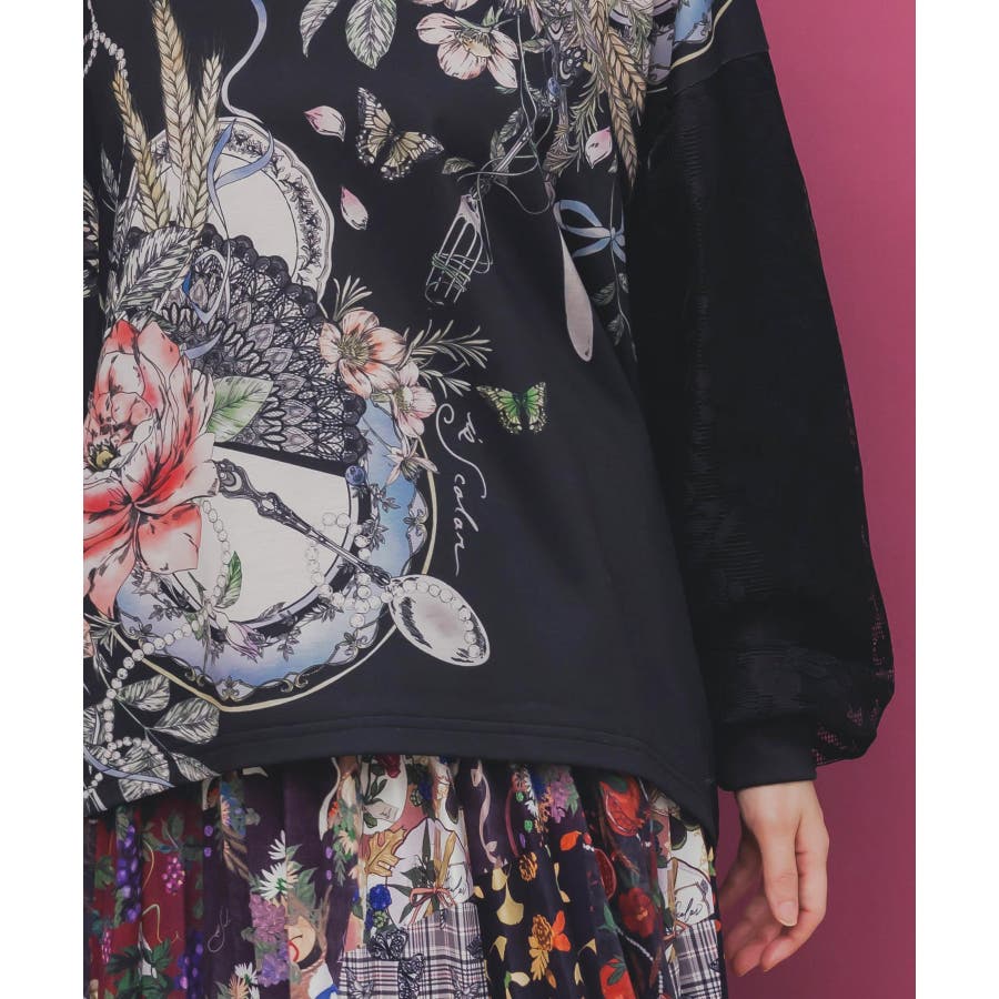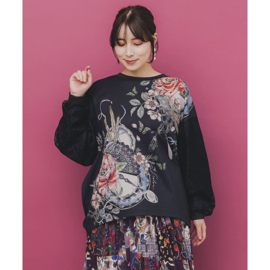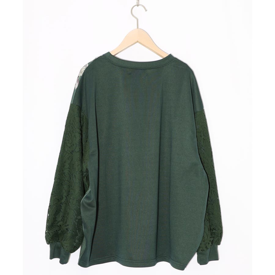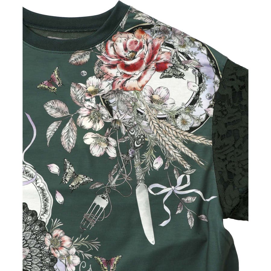袖にはカットソー生地の上から繊細な花柄レースを重ね、ふわりと優しいフェミニンなデザイン。