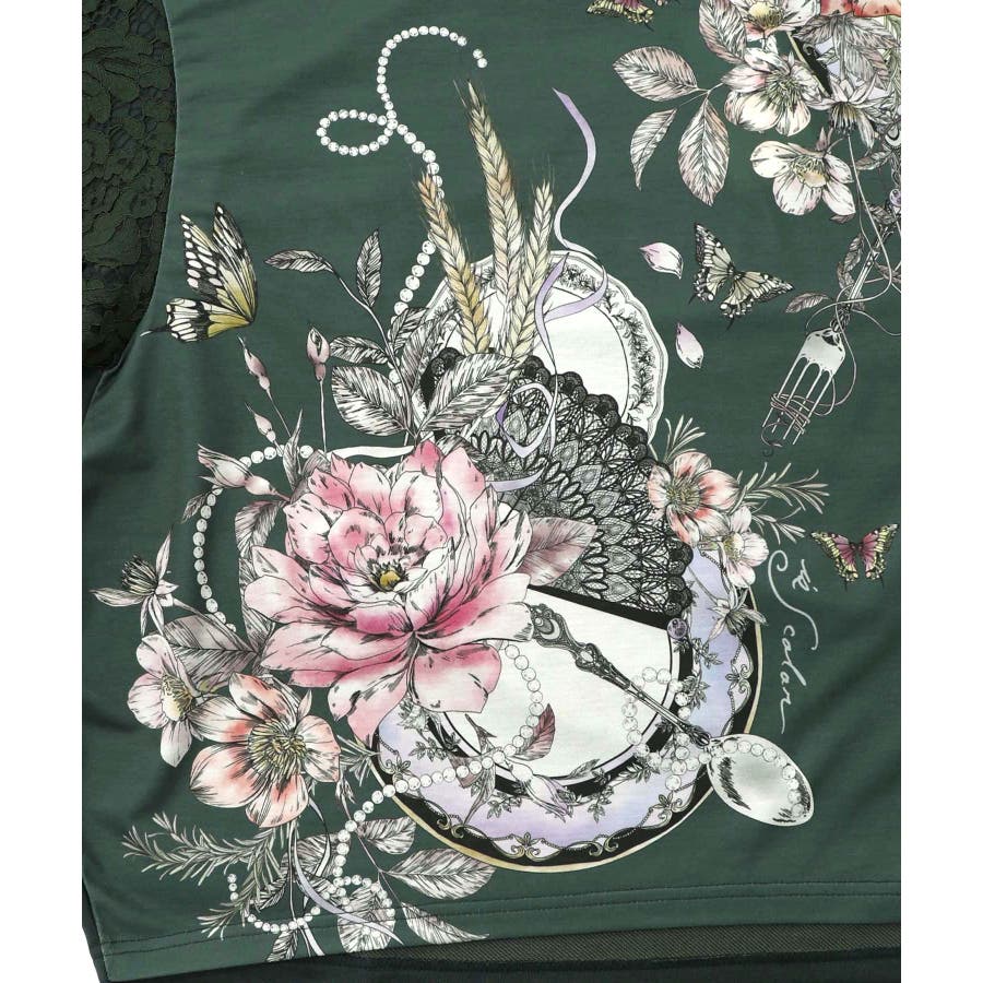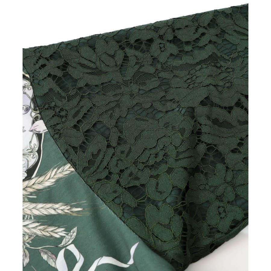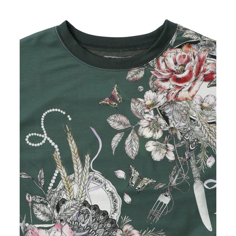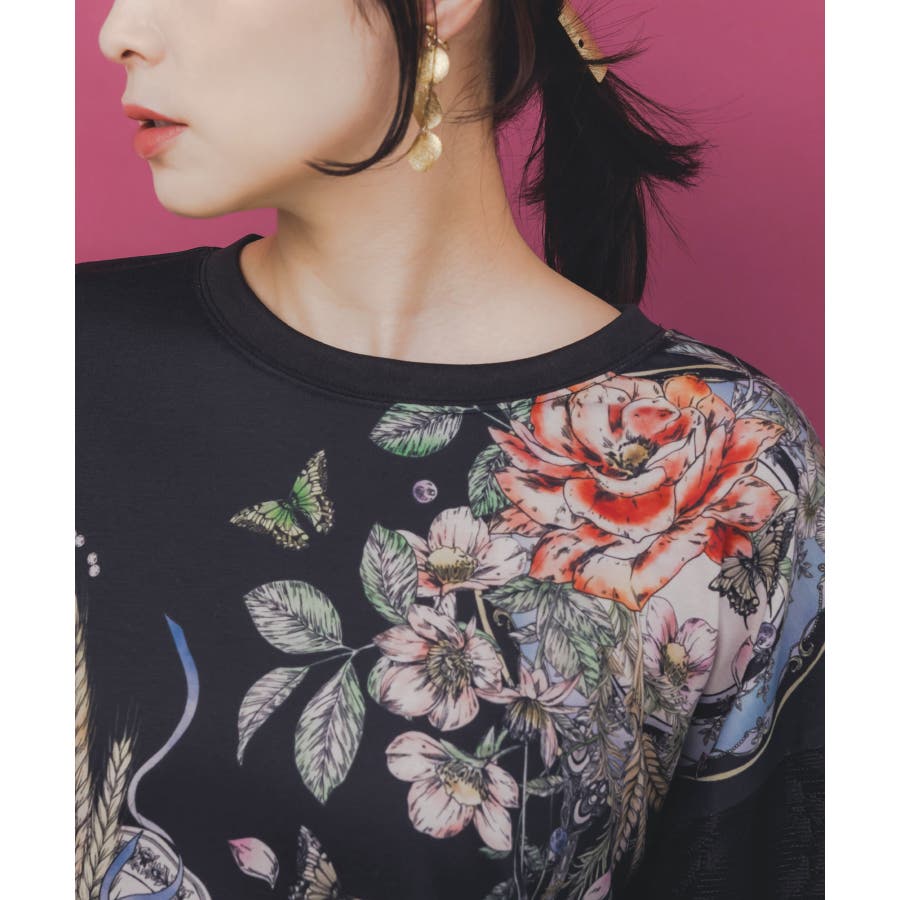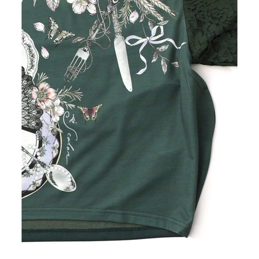袖にはカットソー生地の上から繊細な花柄レースを重ね、ふわりと優しいフェミニンなデザイン。